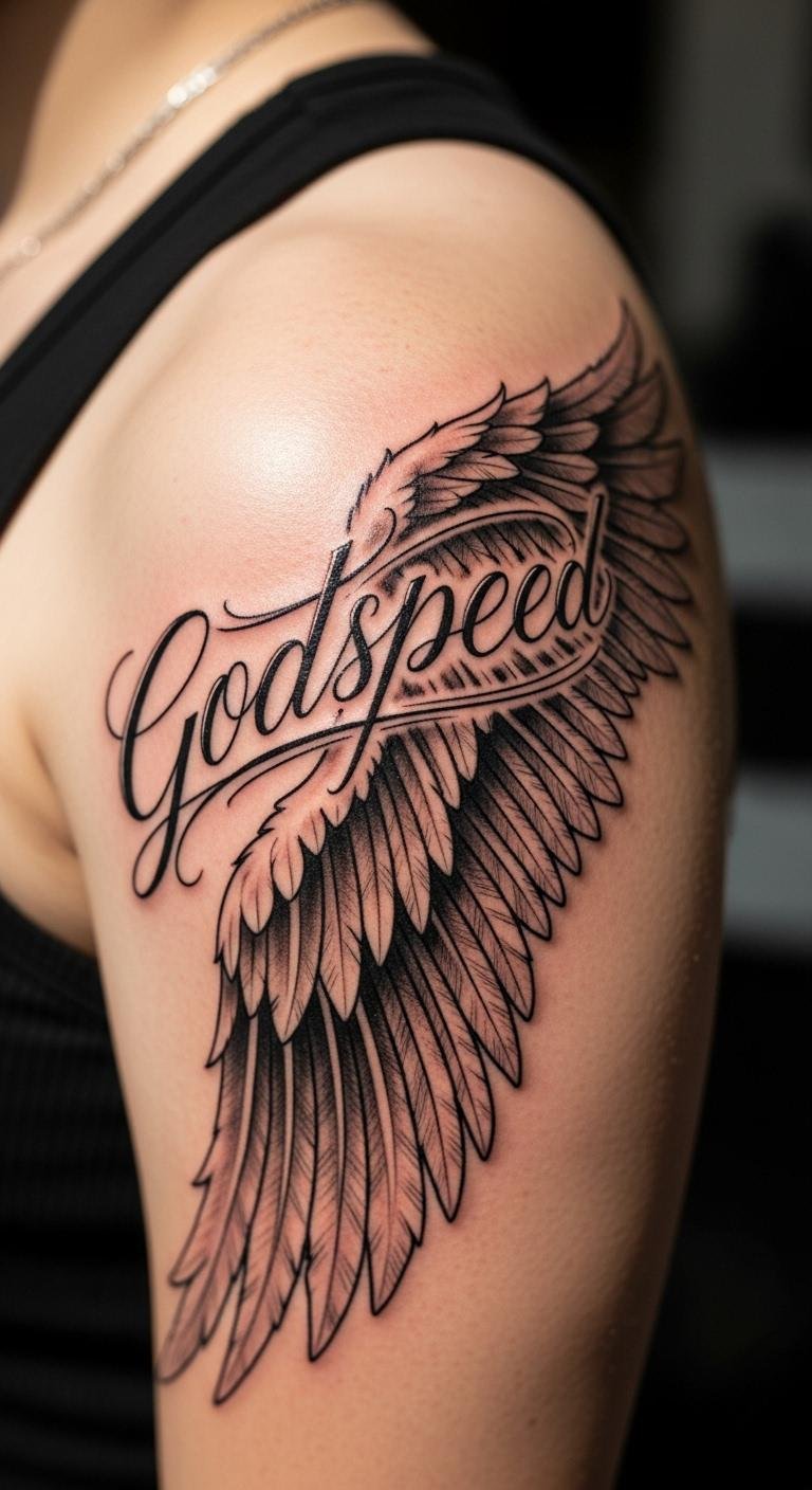 Wings add a sense of freedom to your Godspeed tattoo. Pair them with the script for lift-off vibes. Draw basic wings on paper first. Use shapes from nature photos as guides. Place it on your back for a hidden gem. This setup stays affordable with local artists. Ink just the essentials to save money. Combine it with a simple feather for extra meaning. Test ideas with temporary tattoos from stores. They cost little and let you preview the look. Make your own temp version with markers and stencils. It’s a fun way to experiment. Your design turns into a daily push for bold moves.