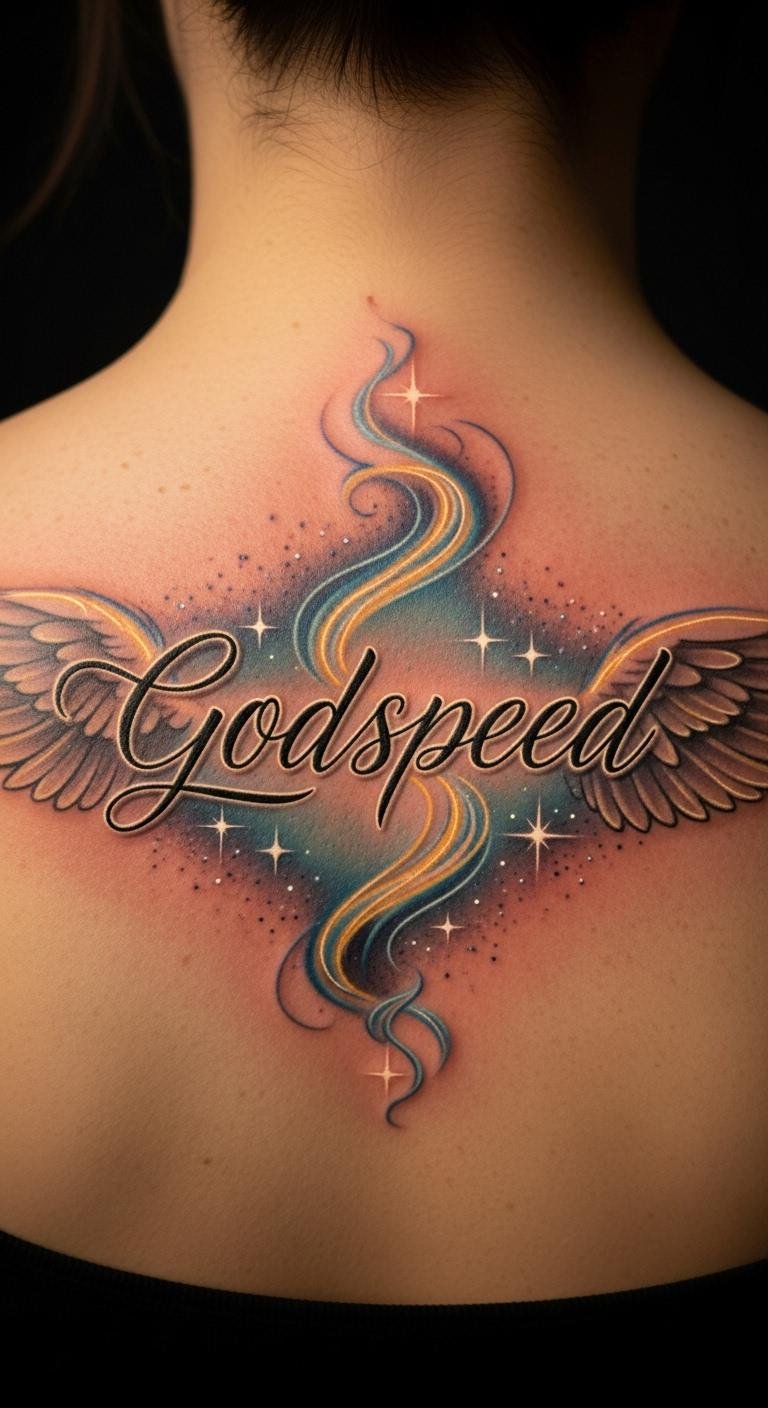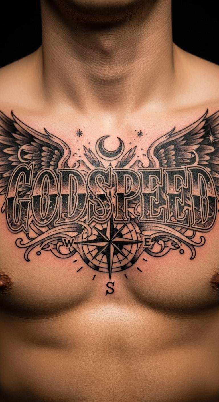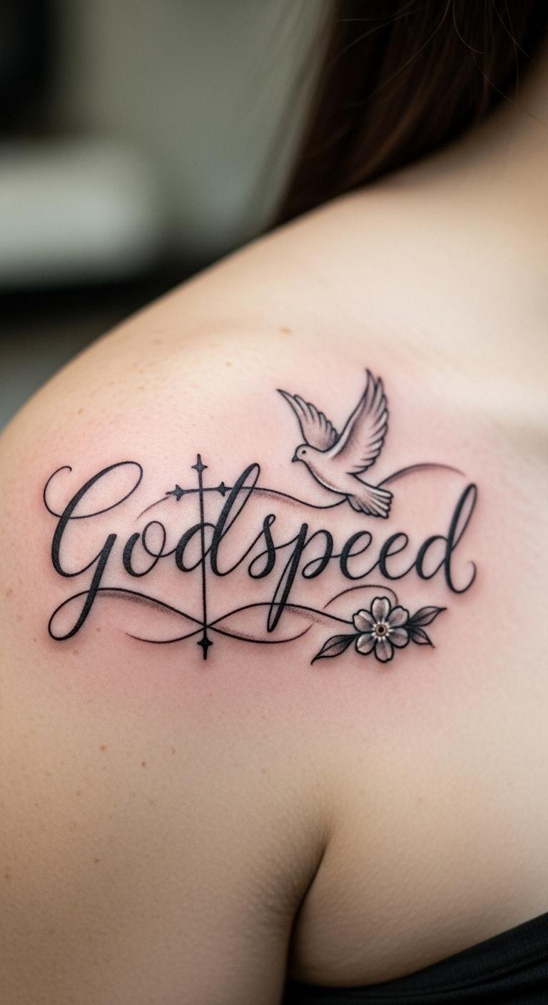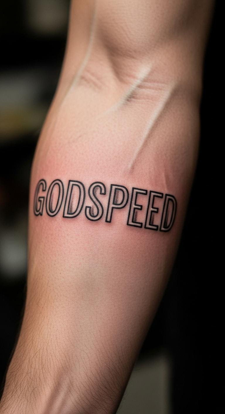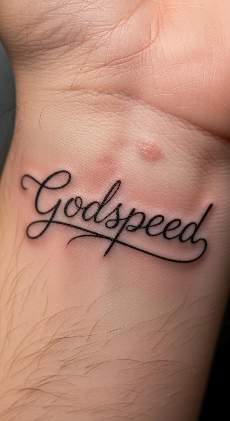 Think simple lines for a timeless look. A minimalist Godspeed script keeps things clean and easy to read. Start with a basic design on paper. Sketch the word “Godspeed” in a sleek font. Use free online tools to tweak it. Pick a spot like your wrist for daily reminders. This style fits any budget. Grab a pen and practice drawing it yourself before visiting a shop. Opt for black ink to keep costs low. Add a small dot or line for a personal twist. You’ll create something meaningful without extra fuss. It’s perfect for first-timers. Try this at home: trace designs from tattoo books or apps. Focus on steady hands. Your tattoo becomes a quiet motivator for new paths.