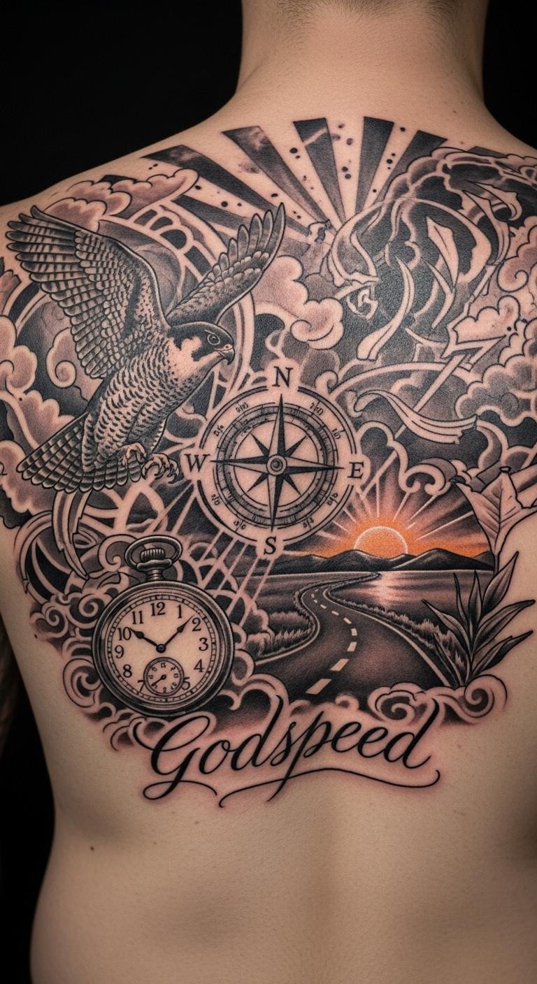 Mix motifs in Godspeed for layers. Combine stars and feathers. Draw combined sketches. Gather motif ideas online. Spread on your back. Select a few for cost. Blend carefully. Make collages at home. Artistic and cheap. This tattoo tells a full story. Try with scrap paper.