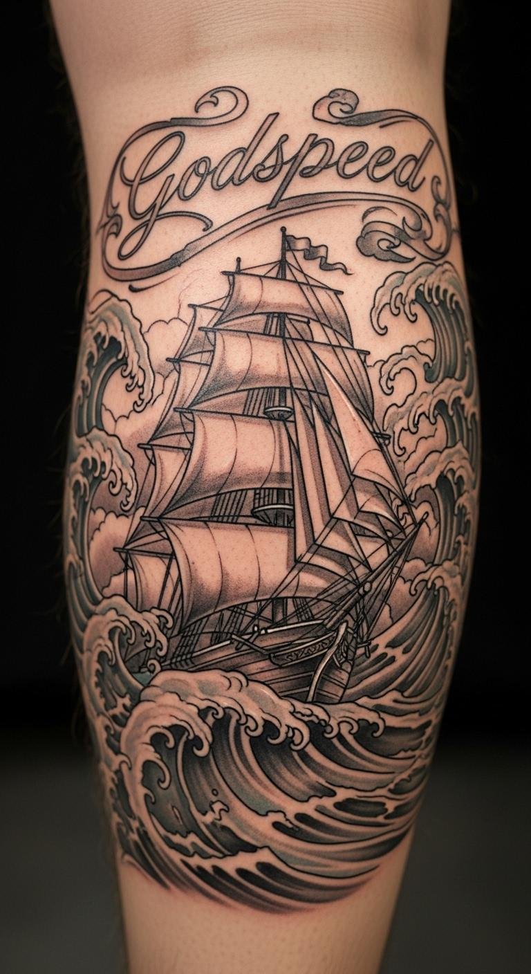 Ships symbolize smooth journeys with Godspeed. Add sails to represent adventure. Sketch a small ship outline at home. Find boat drawings online for ideas. Place it on your leg for strength. Go for simple lines to cut costs. Include waves for a full story. Use household items like string to trace patterns. This keeps things cheap and creative. Your tattoo reminds you of steady progress. Test with stick-on versions from craft stores.