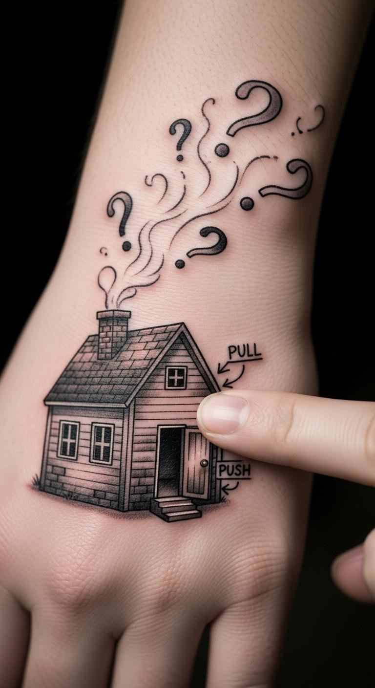 Make a house tattoo a conversation starter with fun additions. It invites stories from others. Place it on your hand for notice. Add quirky elements to your sketch. Real DIY tip: Test reactions by drawing it temporarily with markers. Go basic to stay cheap. This design sparks talks easily. Select a quick-service artist. You’ll enjoy the social boost it brings.