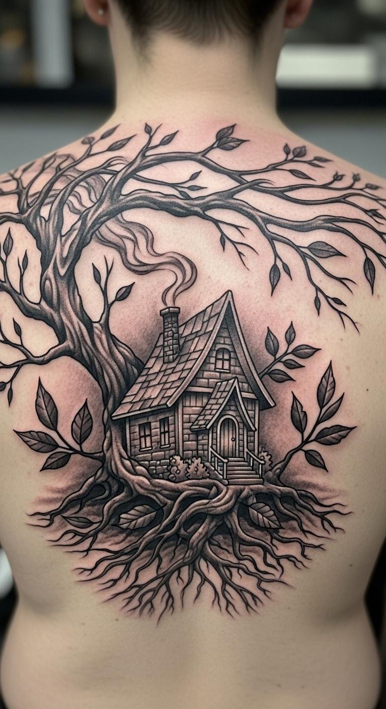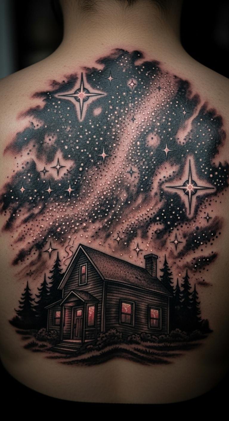 Combine a house with stars or moons for a dreamy look. It adds wonder to your ink. Try your back for space. Sketch celestial parts around a house. Real DIY example: Use star stickers on paper to plan layouts. Choose few elements to save money. This tattoo feels magical. Look for artists who do celestial work affordably. It will inspire you nightly.