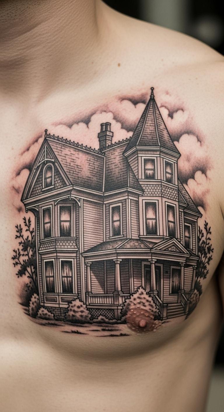 Black and gray ink gives a house tattoo a timeless quality. It’s clean and striking. Place it on your chest. Shade your drawing for effect. Real DIY tip: Use pencils to mimic gray tones on paper. This style is cost-effective. It wears well over time. Choose an experienced artist for best results. Your tattoo will look sharp for years.