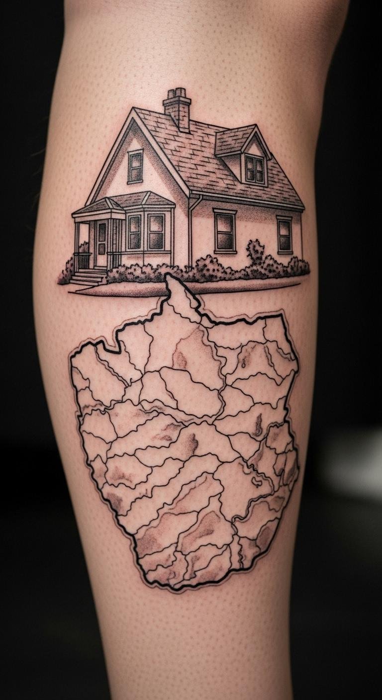 Add your country’s outline to a house tattoo for heritage pride. It tells a cultural story. Try your leg for size. Sketch maps with the house. Real DIY example: Trace country shapes from atlases. Keep it simple for affordability. This design honors roots. Select a detail-oriented artist. Your tattoo will reflect your background.