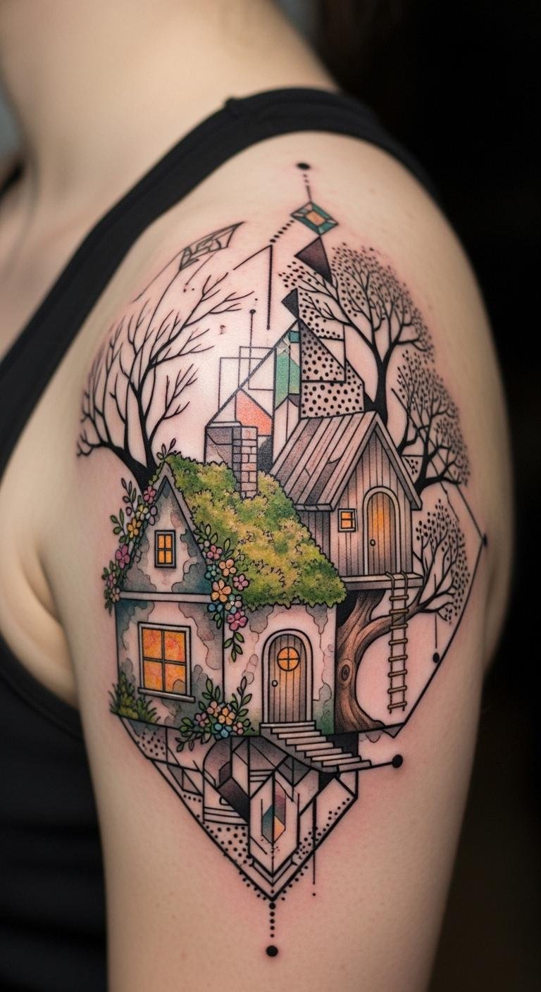 Geometric shapes make a house tattoo abstract and bold. Use angles for a sharp look. Try your back. Plan shapes on paper. Real DIY tip: Cut out geometric forms from cardstock. This saves on complex ink. It’s visually striking. Choose a geometric expert. Your design will stand out strongly.