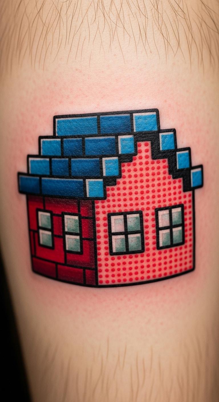 A pixelated house tattoo nods to old video games with its fun, blocky look. It’s great for gamers wanting nostalgia. Place it on your calf for a playful hideaway. Practice by pixelating images on free computer tools. Real DIY example: Create your design using graph paper and markers at home. Keep it small to save on ink costs. This style is quick to get done. Search for affordable artists who handle modern designs. Your tattoo will bring back memories without much hassle.
