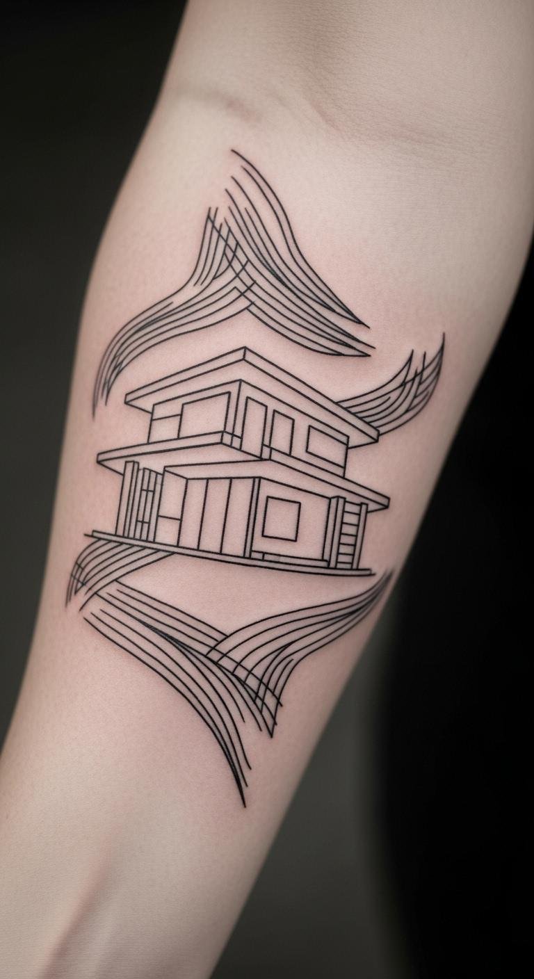Abstract linework gives a house tattoo a modern, artistic edge. It uses curves and shapes for a unique vibe. Try your arm for visibility. Experiment with lines on paper first. Real DIY example: Use string and paper to map out flows at no cost. Keep it simple to lower prices. This style stands out easily. Look for artists skilled in line art. Your tattoo will feel contemporary and personal.