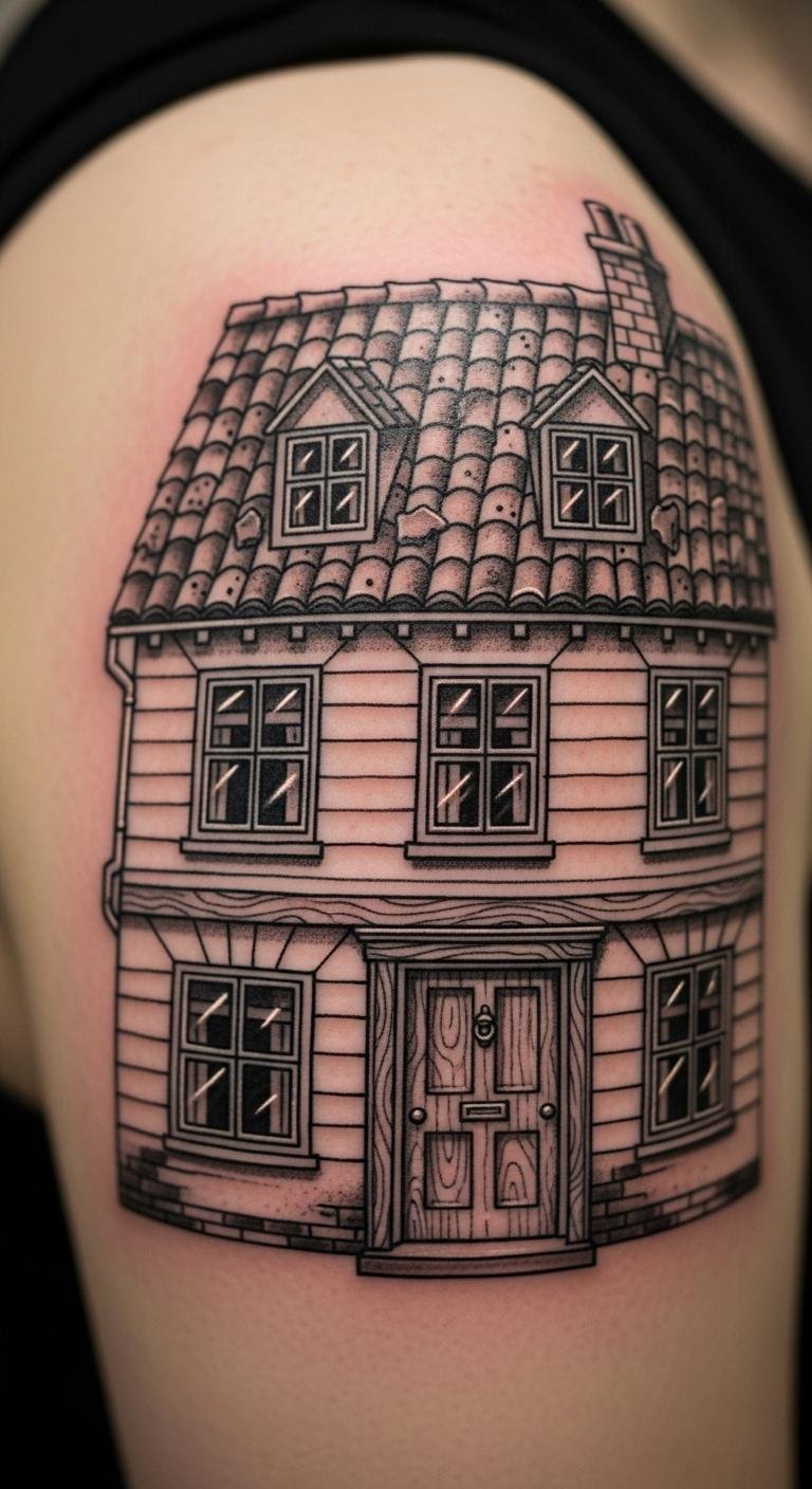 Personalize your house tattoo with specific details like windows or doors. It makes the design truly yours. Put it on your shoulder for impact. Sketch custom parts on a base house drawing. Real DIY tip: Use old photos of your home to add accurate features. Opt for fewer details to save on costs. This approach adds meaning without fuss. Book with a flexible artist. You’ll end up with a one-of-a-kind tattoo.