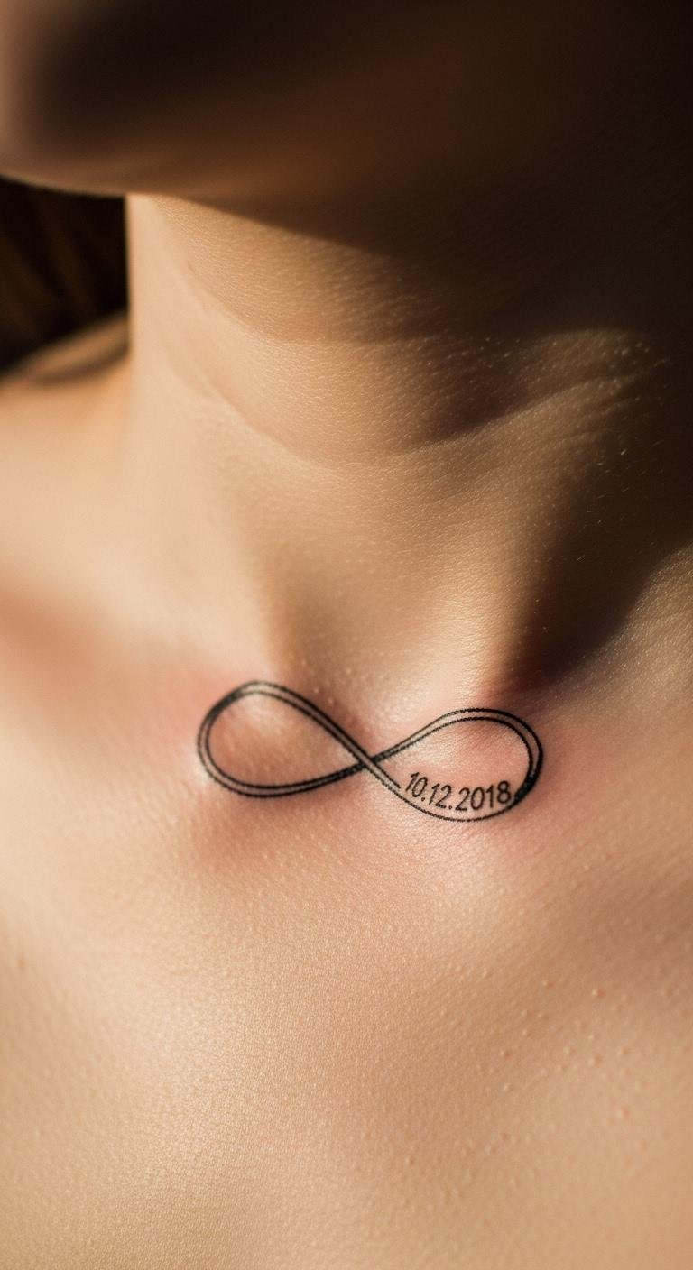 An infinity with a date remembers loved ones eternally. Put it on your collarbone for sentiment. Budget $85 and use basic numbers to save. Write dates on paper first for accuracy. Combine with a symbol for depth affordably. Bold key: memorial eternal love. This honors losses with grace. Choose a sensitive artist for the process. Meaningful and budget-friendly.