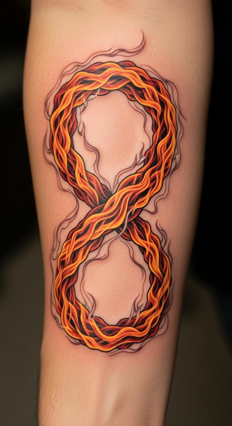 Fire infinity ignites passionate bonds. Set on your arm for energy. Go for $90 with minimal flames. Sketch fires at home first. Keep it fiery yet simple. Bold key: fire eternal love. This heats things up. Find an artist for quick work. Dynamic and affordable.