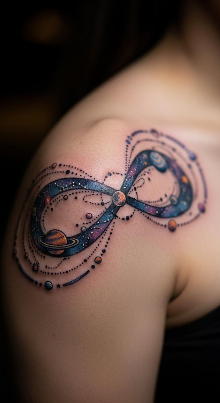 Celestial infinity with planets explores cosmic love. Put on your shoulder for wonder. Budget $95 with few planets. Use star maps at home for ideas. Link elements simply. Bold key: celestial eternal love. This sparks curiosity. Book with a cosmic artist. Awesome and budget-friendly.