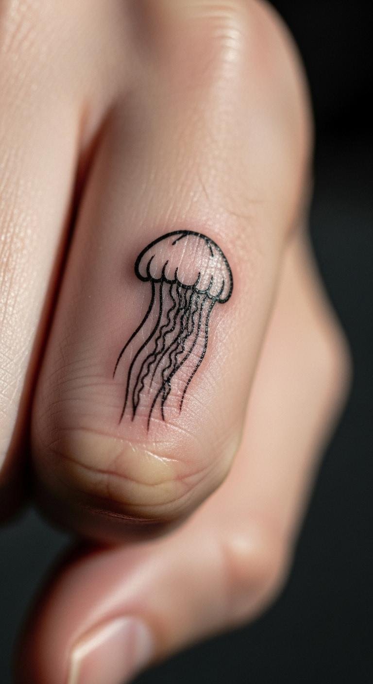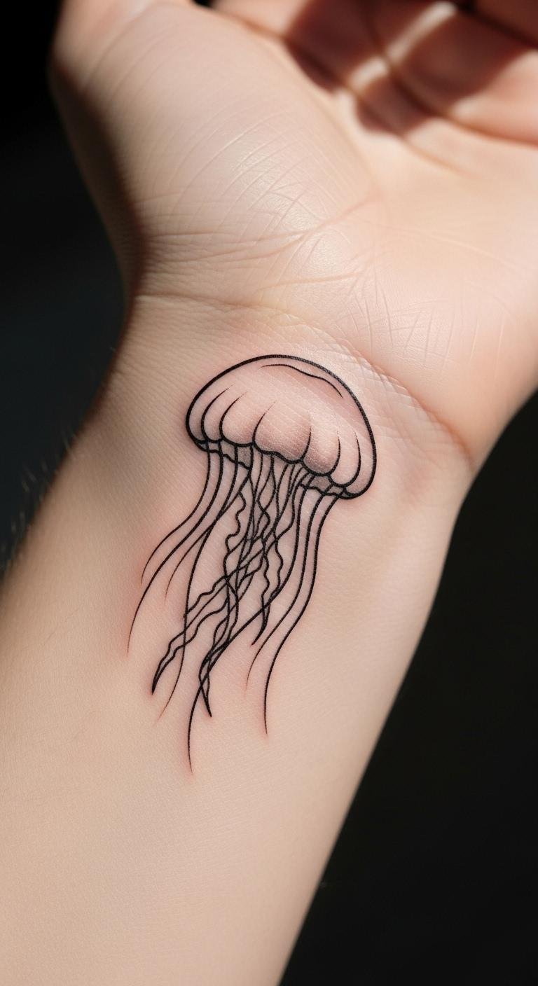 Think simple lines and clean shapes for a minimalist jellyfish tattoo. This style keeps things elegant without overwhelming your skin. Start with a basic outline of the jellyfish body and a few flowing tentacles.