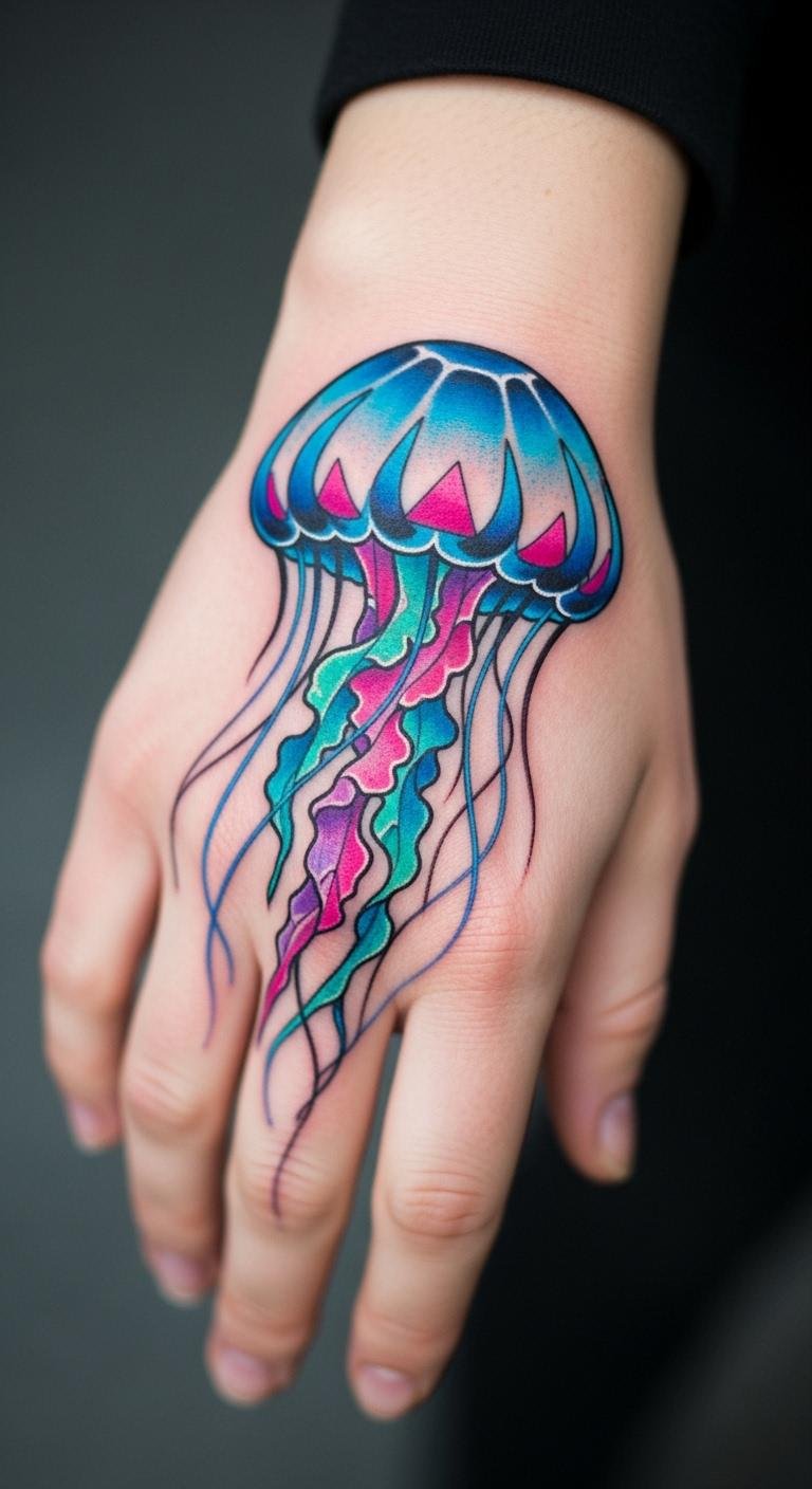 Go bold with neon colors for a standout jellyfish tattoo. Use electric hues for pop.