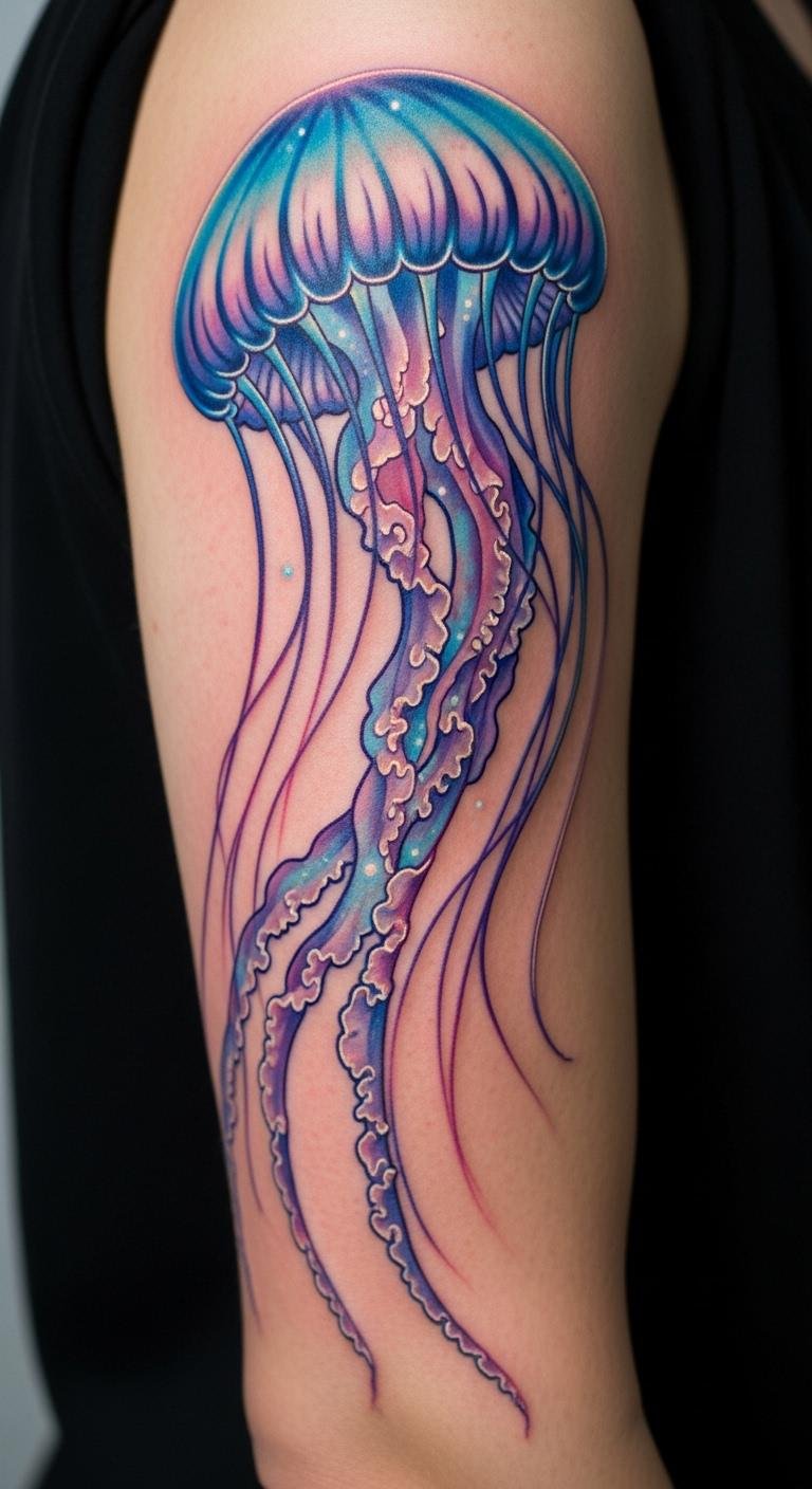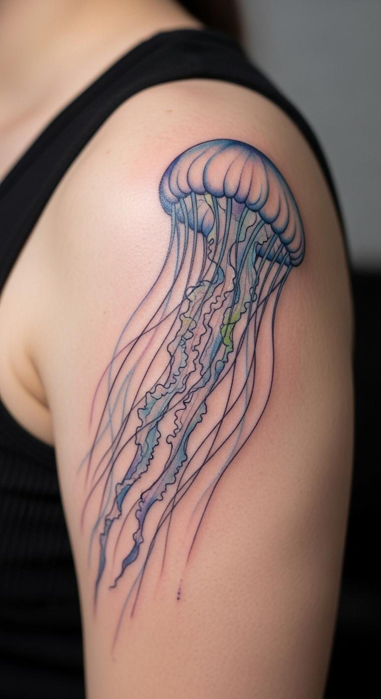 Watercolor jellyfish tattoos bring vibrant, flowing colors to life. Imagine soft blends of blue and purple that look like ocean waves.