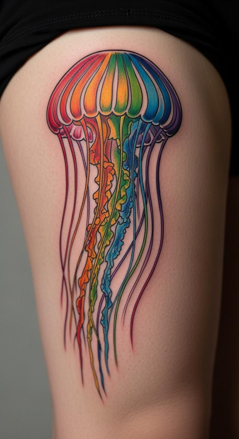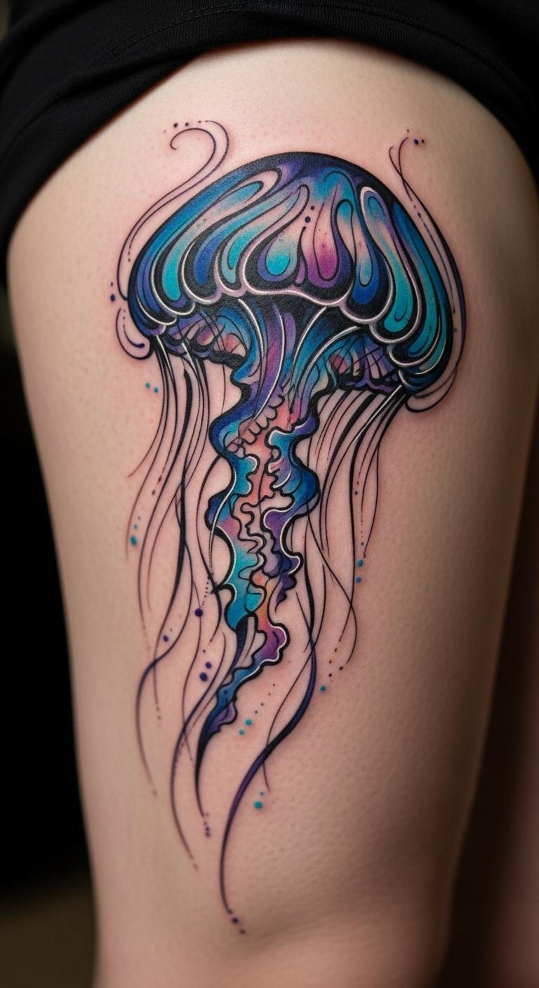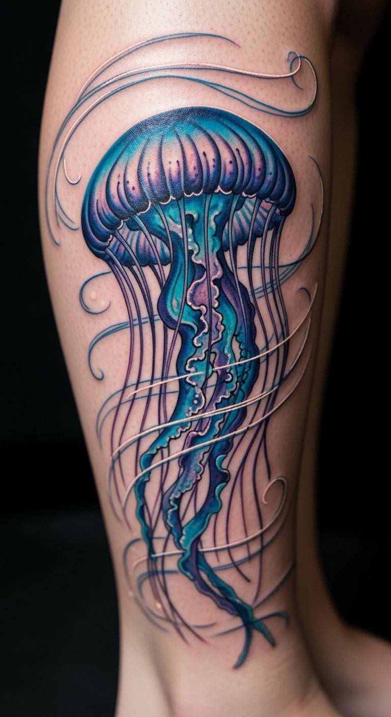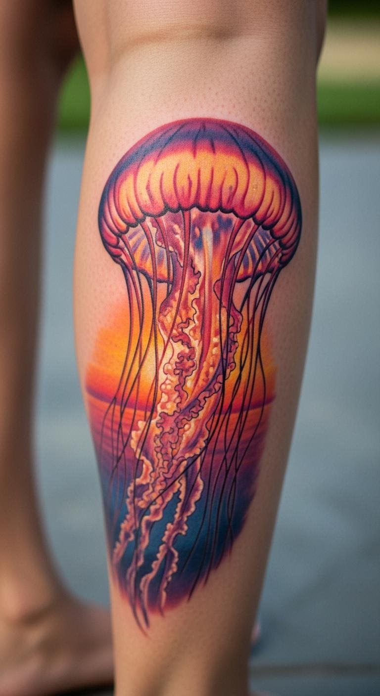 Use sunset colors for a jellyfish on your calf. Oranges and reds mean end-of-day freedom. It glows like a setting sun. Blend colors with pastels at home. Test on paper. Price at $130. Find sunset palettes online. Add rays for effect. This tattoo frees your evenings. Spot it on your leg. Finish quickly. Draw it on photos first.