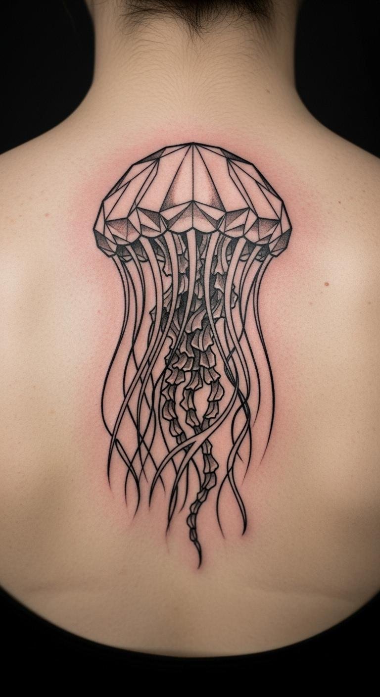 Try a geometric jellyfish on your back. Sharp shapes frame the free-flowing parts. It blends order with wild spirit. Draw squares and circles on paper first. Use a ruler for precision. Local shops offer this for around $200. Search for DIY stencils online. Make it your own with added stars. This design means freedom within boundaries. Pick a spot that shows strength. Get it done in a few hours. Experiment with string art at home. Keep lines clean and bold.