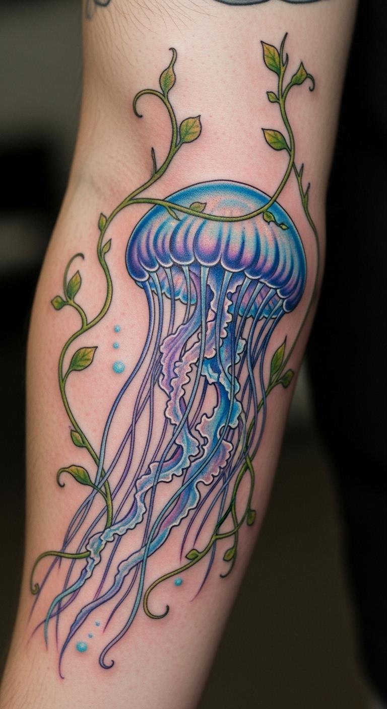 Wrap vines around a jellyfish on your arm. Vines grow for ongoing freedom. It climbs high. Draw vines with green markers. Let them spread. Cost $150. Use vine stencils online. Personalize growth. This tattoo vines your progress. Place it long. Step-by-step. Test on plants.
