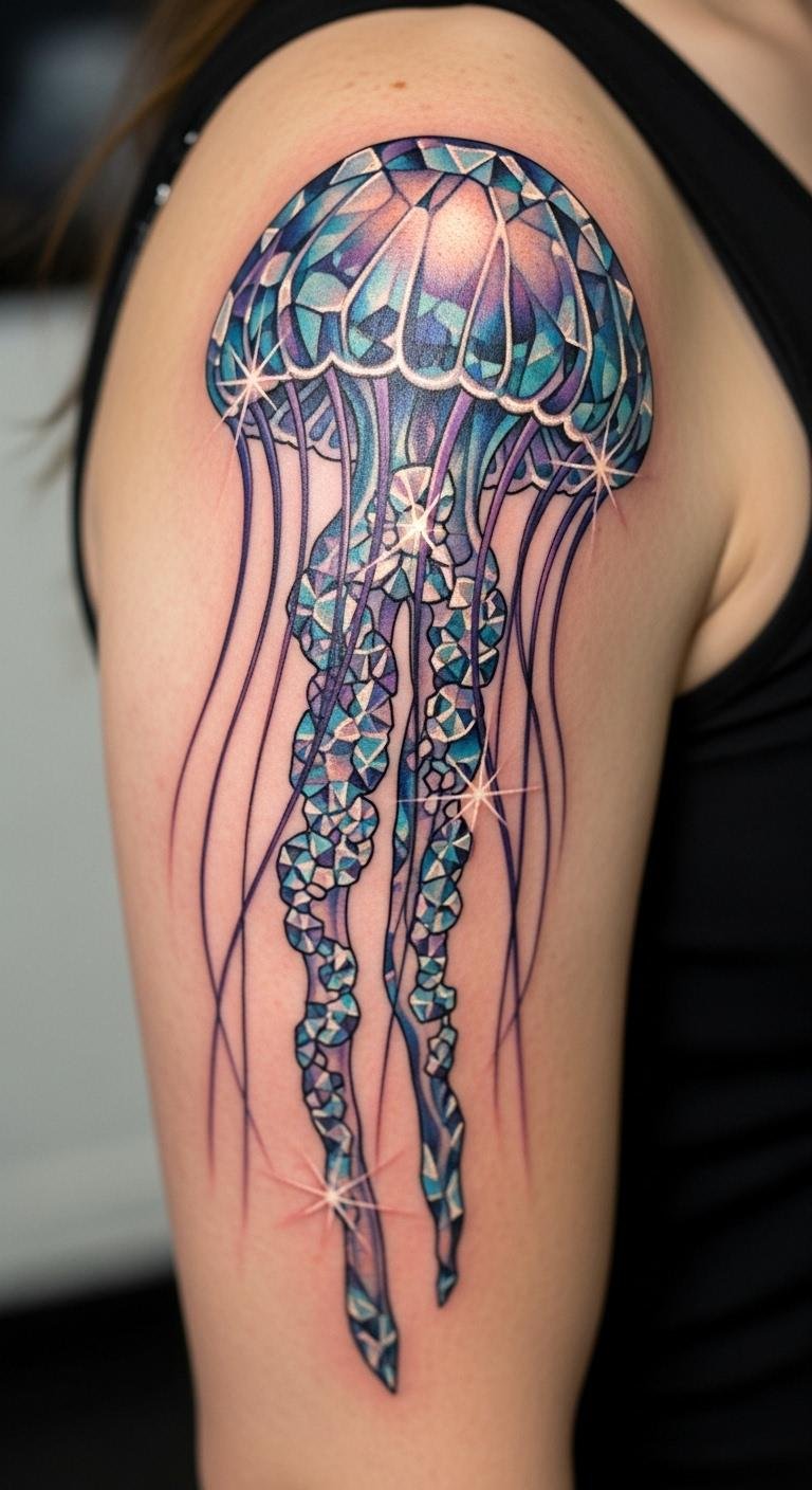 Add crystals to a jellyfish on your shoulder. Shimmers mean bright freedom. It gleams like gems. Dot crystals on paper. Make them shine. Price at $160. Find crystal designs free. Adapt shines. This tattoo crystals your light. Center it firm. Phased ink. Draw on gems.