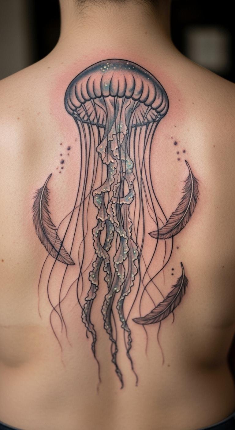 Add flowers to a jellyfish on your back. Petals mix with freedom’s flow. It blooms like wild nature. Sketch flowers with markers. Layer them on. Artists charge $170. Use free floral stencils. Customize colors. This tattoo grows your liberty. Place it prominently. Do it step-by-step. Practice on leaves.