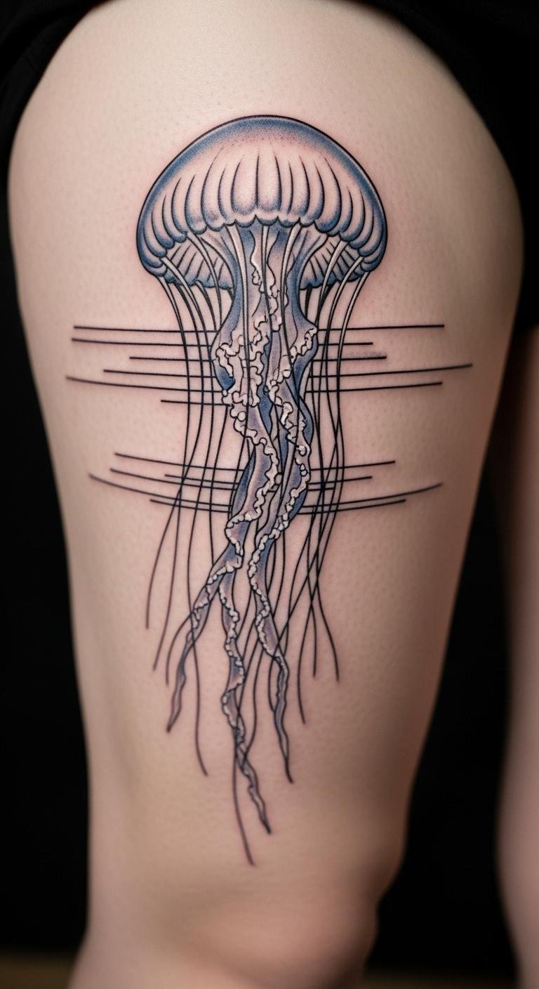 Add horizon lines to a jellyfish on your leg. Lines stretch for endless freedom. It goes on forever. Draw lines straight. Extend them far. Cost $140. Find horizon templates online. Personalize distances. This tattoo horizons your path. Place it low. Fast ink. Try on horizons.