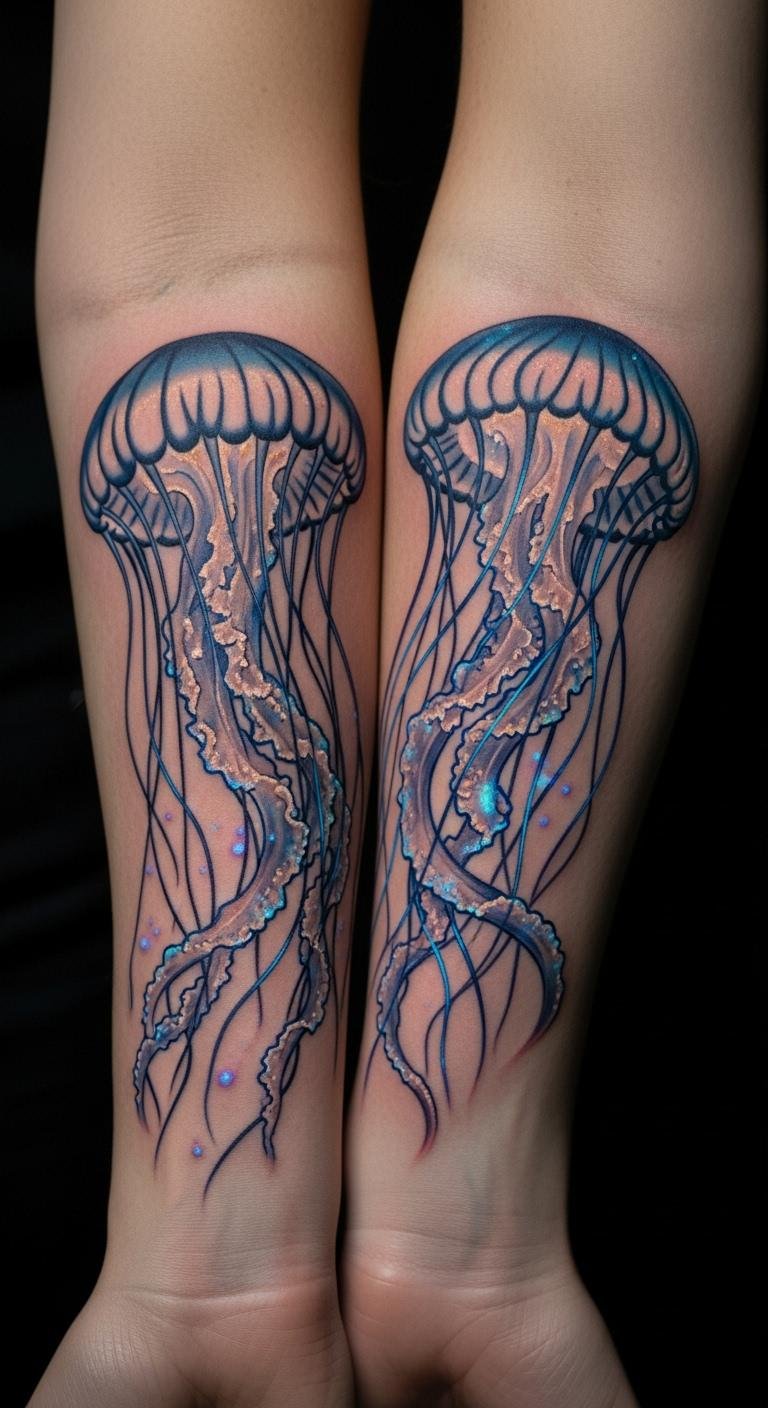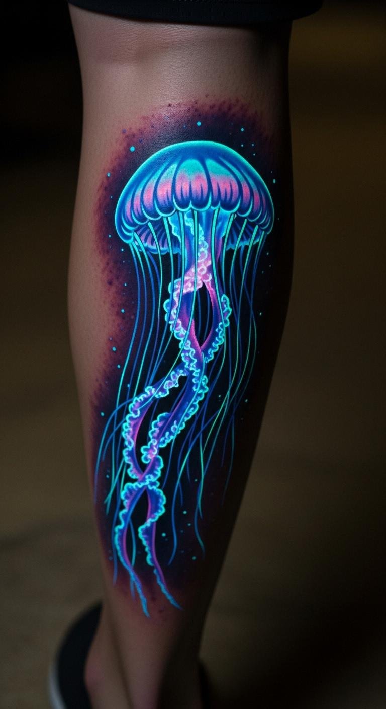 Consider a bioluminescent jellyfish on your leg. Glow-in-the-dark ink makes it pop at night. It represents freedom in the dark. Buy glow paints for home trials. Test on fabric scraps. Artists charge about $180 for this. Add faint stars around it. This tattoo glows like inner light. Place it where clothes hide it. Do a quick session. Practice with LED lights. Let it remind you of hidden strength.