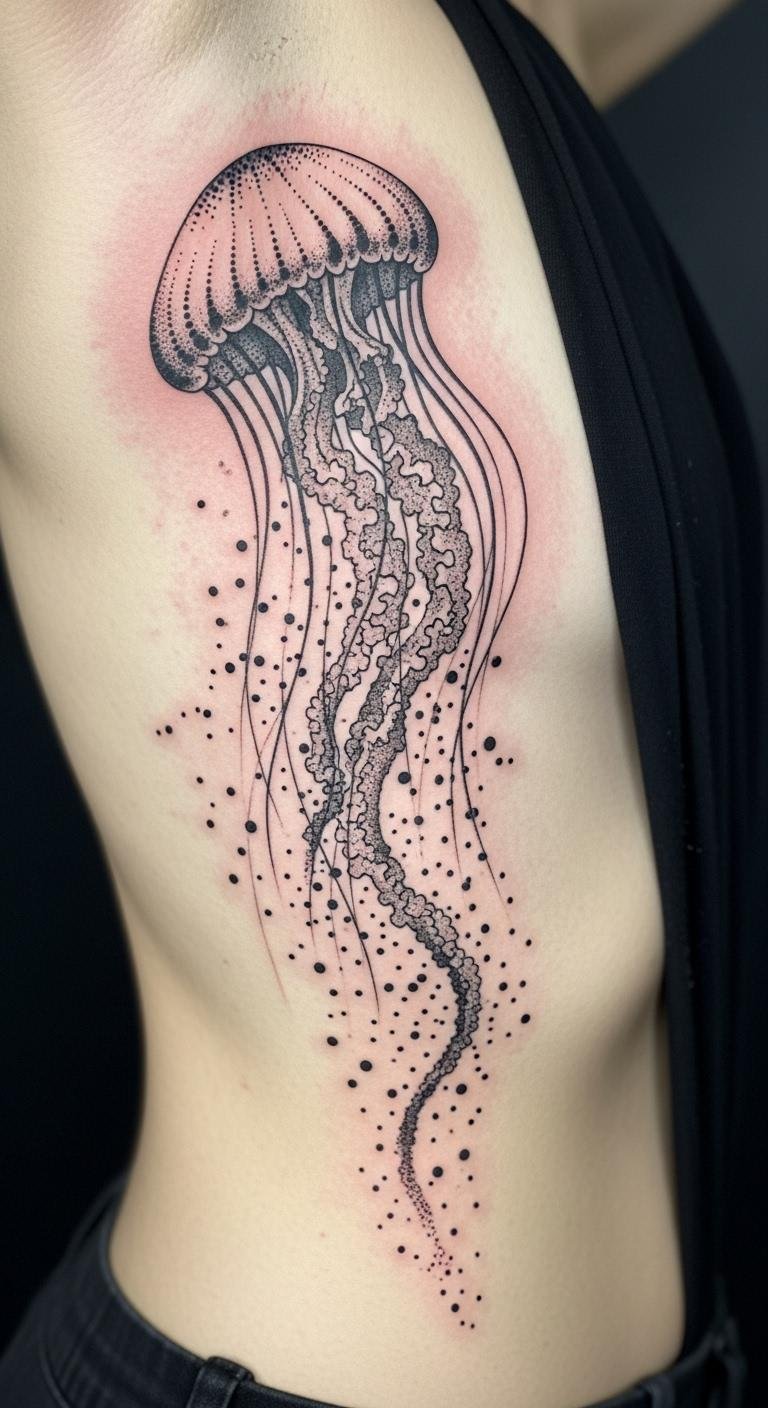 Add wind lines to a jellyfish on your leg. Swept forms mean breezy escape. It flows like air. Draw lines with a fan nearby. Swirl them out. Price at $140. Get wind templates free. Make it dynamic. This tattoo blows stress away. Place it low. One session. Practice in wind.