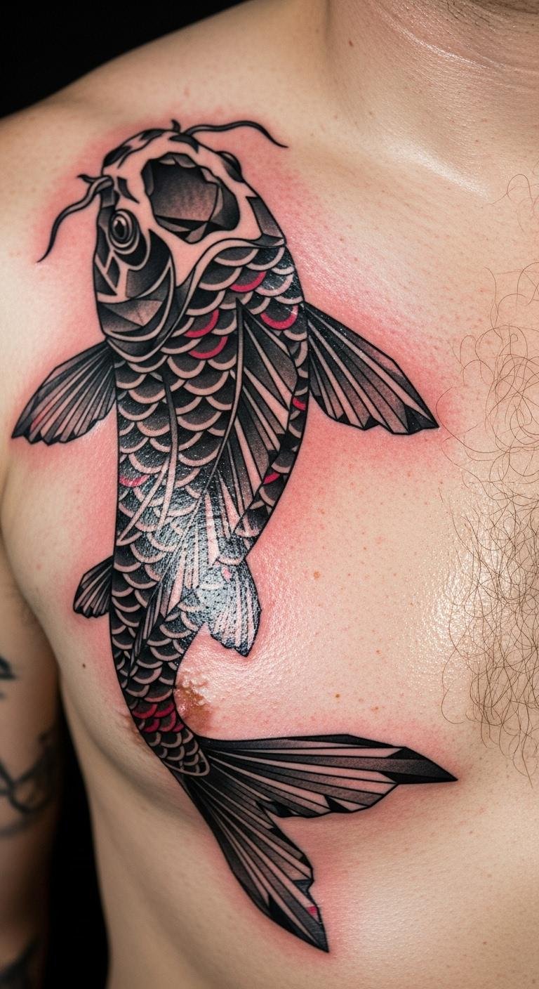 Geometric koi builds strength with angles. Patterns form a fortress. A structured symbol. Your geometric guard. Draw grids at home. Apps create patterns. Tattoo on your chest for protection. Budget $70. Look for geometric specials. Add triangles for edge. This pattern fortifies you.