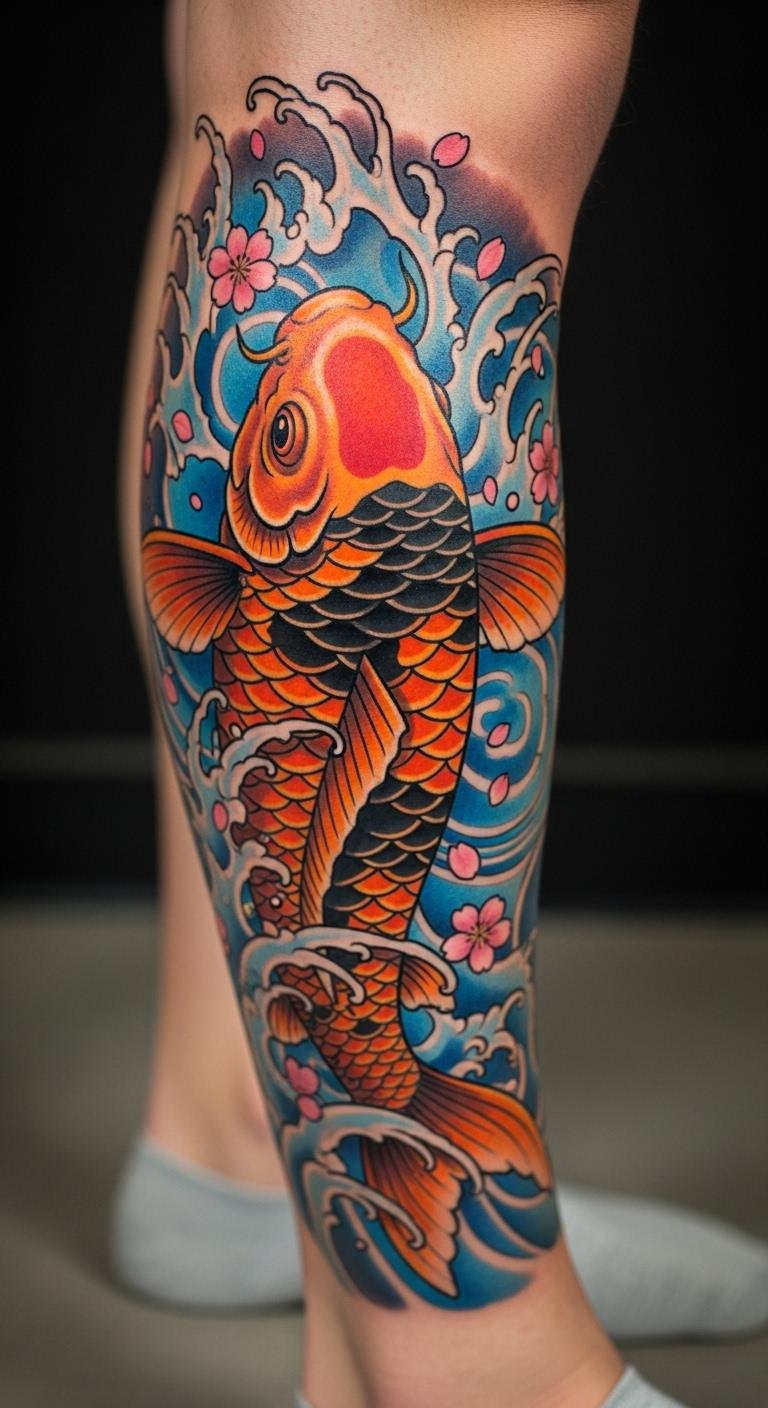 Custom colors make koi your strength story. Blend shades for personal power. A palette of prowess. Tailored to you. Experiment with paints yourself. Apps mix colors digitally. Tattoo on your calf for flair. Budget $80 for custom. Find artist consultations. Choose meaningful hues. This design reflects you.