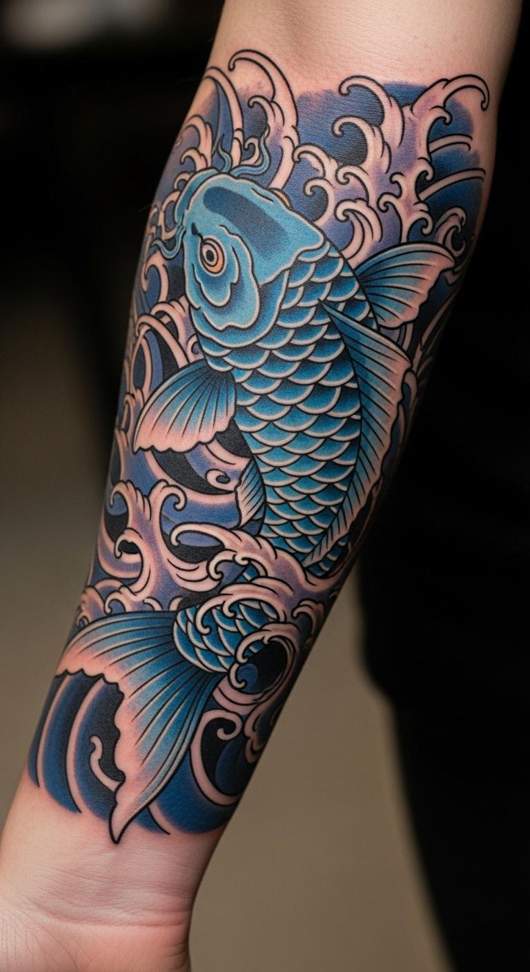 Blue koi brings calm strength. It stands for peace amid chaos. The waves add motion and might. Like steady resolve. Draw waves freehand on paper first. Online generators make patterns easy. Place on your forearm for visibility. Budget around $90 for colors. Find artists offering package rates. Mix in bubbles for fun. This tattoo keeps you centered and strong.