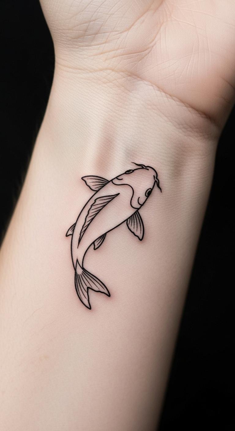Minimalist koi keeps it sleek and strong. Just the essence of power. No extras, pure impact. Easy to love. Sketch outlines with a fine pen yourself. Free tools online perfect the look. Tattoo on your wrist for quick access. Save with a basic rate of $30. Check walk-in options. Keep it small and sharp. This style proves less is more.