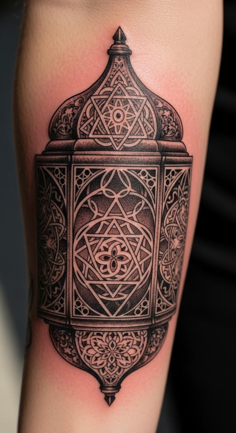 Incorporate shapes like circles for a geometric lantern. It’s balanced and symbolic. Prices: $70. Draw grids at home. This style means harmony. Put it on your forearm for display. Keep elements minimal.