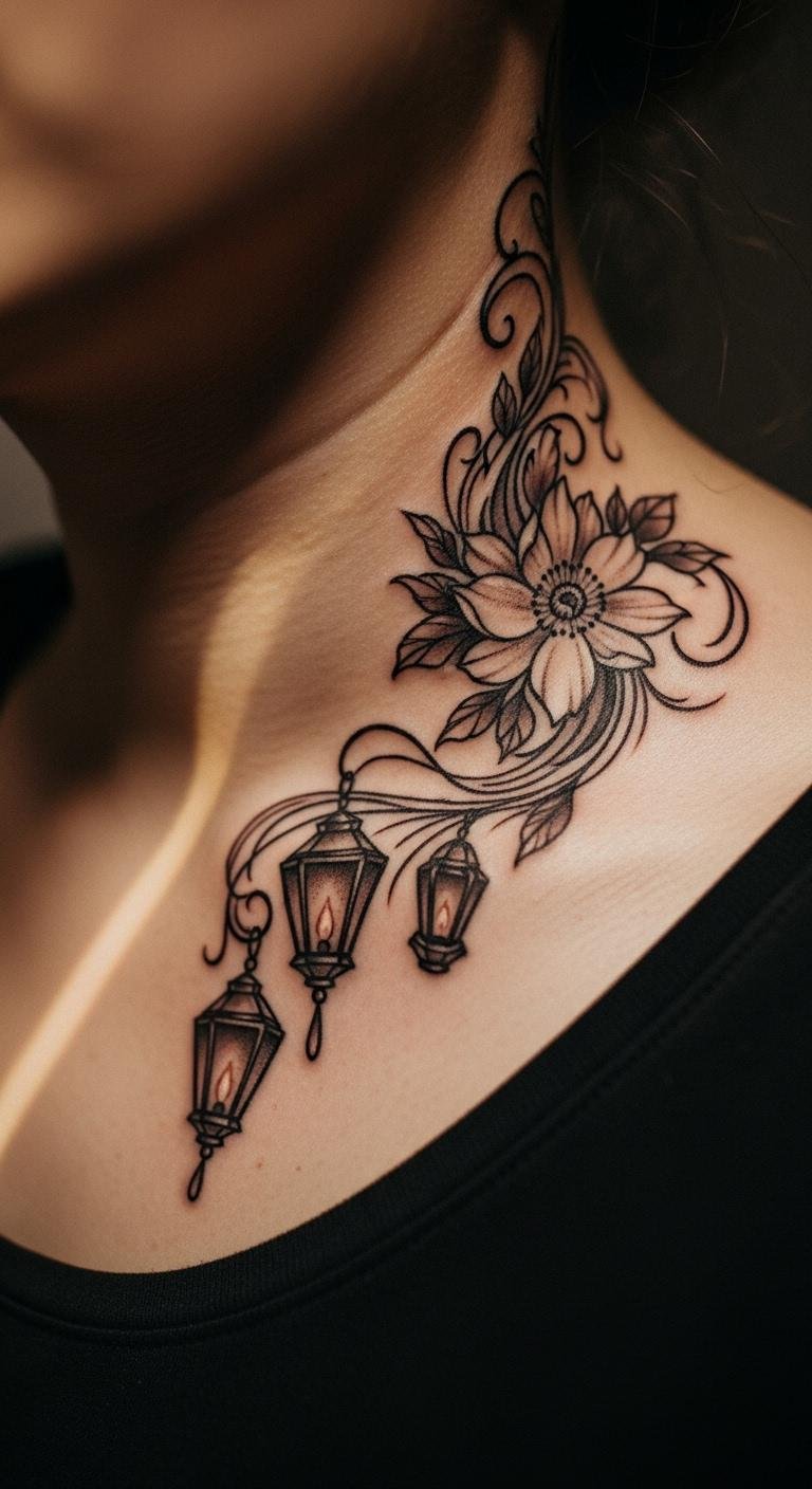 Mix lanterns with flowers for a fresh, nature-inspired look. Petals around the lantern add beauty. Aim for $70–$110. Draw a rough version with colored pencils. This combo means growth and guidance. Place it on your side for flow. Cut costs with fewer details. Use flower stencils at home to plan. These tattoos blend styles easily.