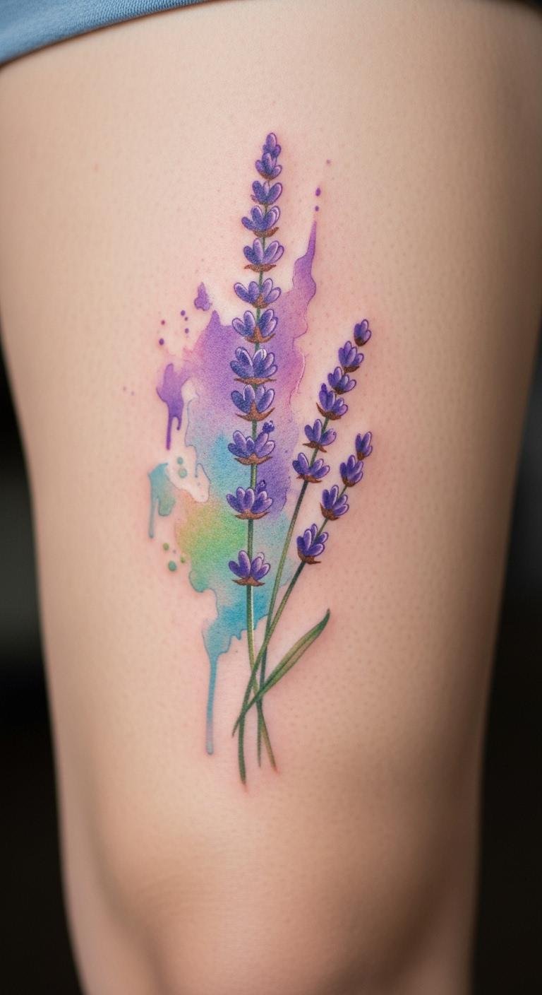 Watercolor gives lavender a dreamy feel. Thigh placements handle the flow. Use pastels for that effect. Budget around $180. Experiment with watercolors at home.