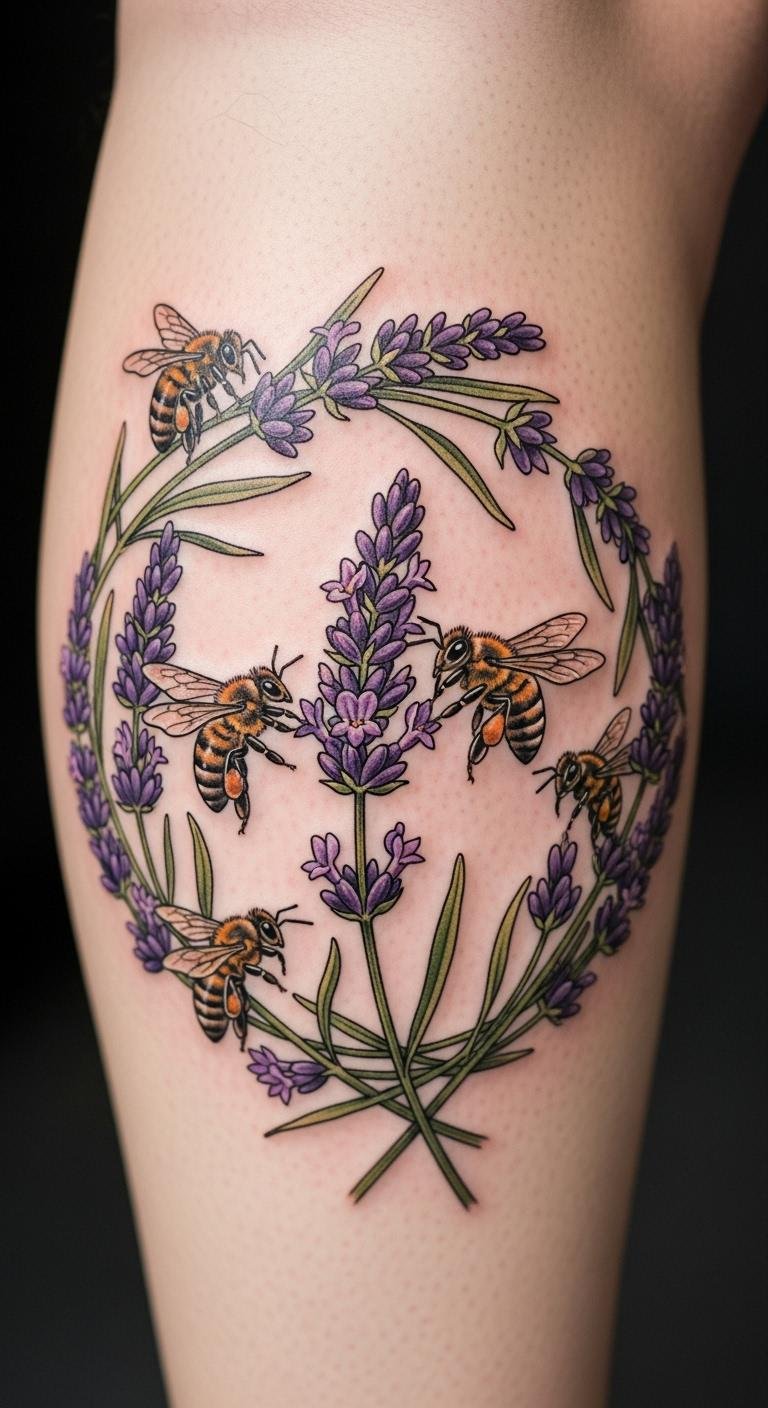 Eco designs feature bees with lavender. Calf areas fit the theme well. It symbolizes nature’s balance. Prices from $120. Watch documentaries for ideas. Draw bees freehand. Add green shades for emphasis.