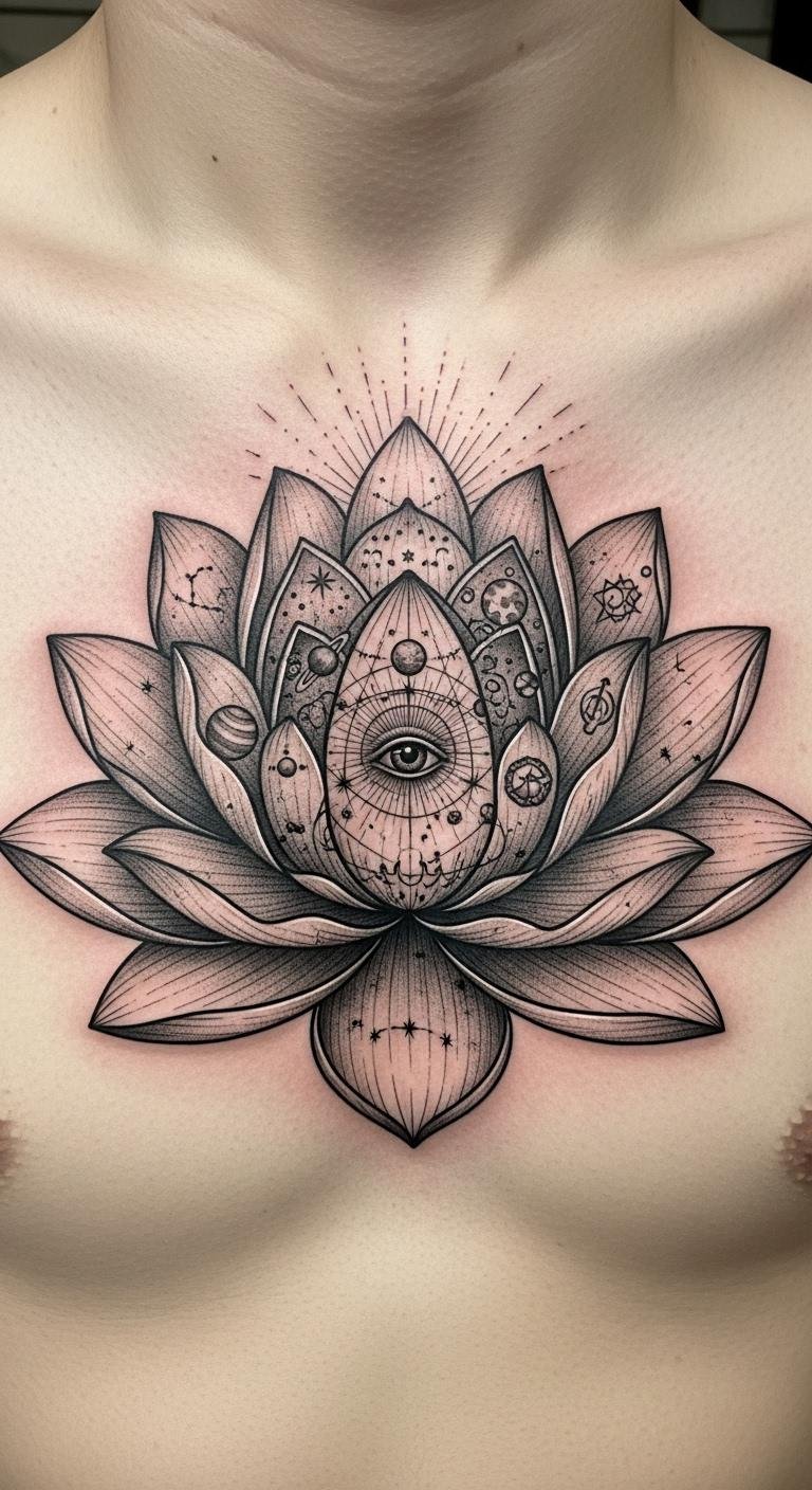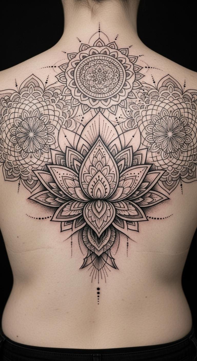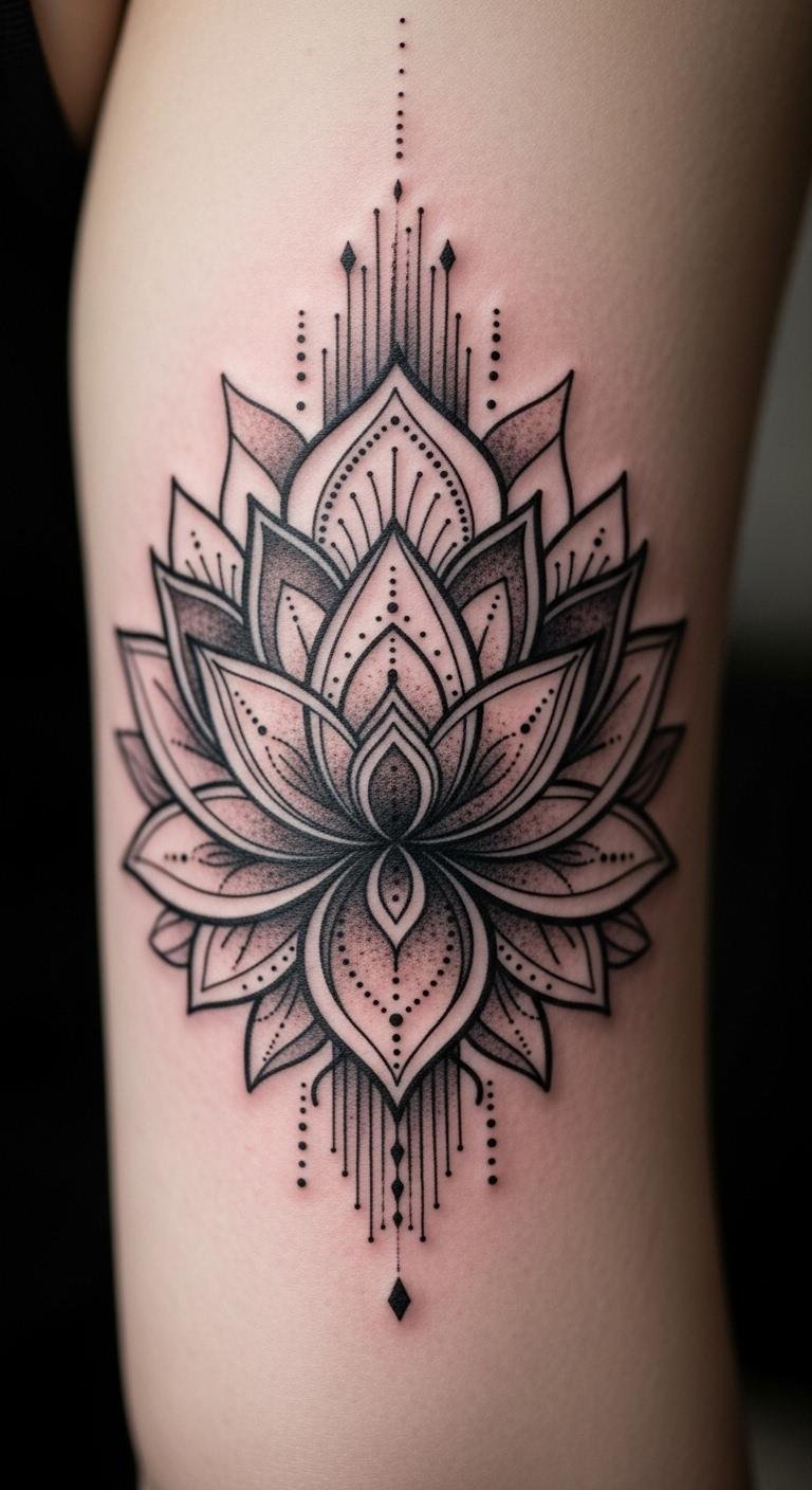 Mandala-lotus fusions create a web of spiritual patterns around the flower. Imagine circles and swirls embracing the lotus core. This design deepens the symbolism of growth and unity. Practice drawing basic mandalas on paper with colored pencils. It costs nothing and sparks ideas. Find free online templates to trace and adapt. Try a temporary version with washable markers for under $5. Seek artists who blend floral and geometric styles for the best results. Their rates often start at $150 for custom work. Opt for upper back placement to symbolize protection. Use black and grey shades for a timeless effect. Add elements like dots to personalize it further. This tattoo offers visual complexity without overwhelming your skin. It’s perfect for a meaningful statement.