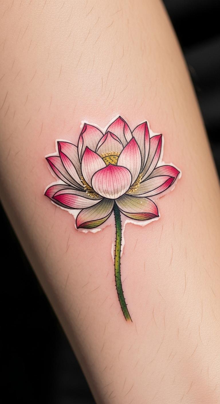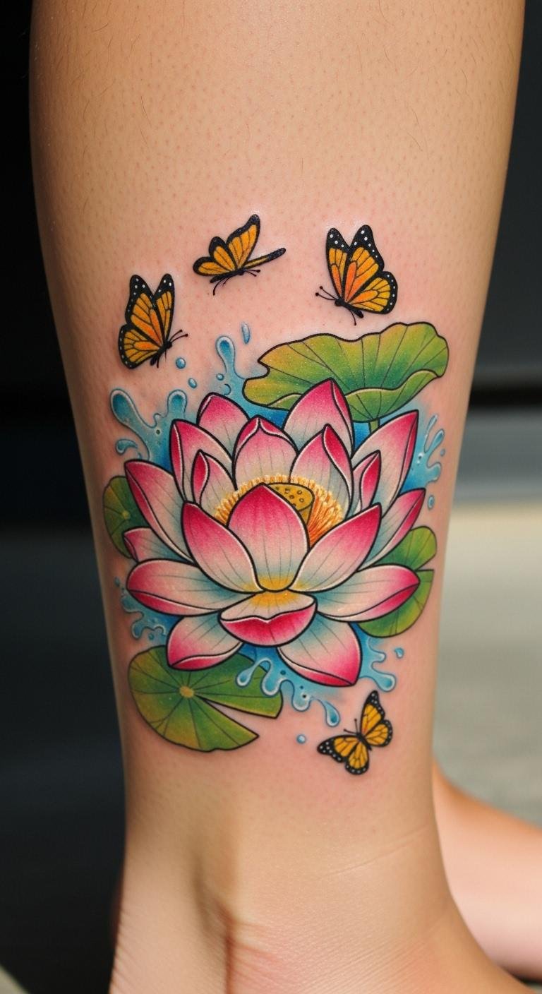 Colorful lotus tattoos bring energy through shifting hues. See petals fade from soft pink to bright blue. This gradient adds life to the design. Experiment at home with watercolor paints on canvas. It’s an inexpensive way to play with colors. Buy affordable markers for quick sketches, costing less than $10. Test gradients on temporary tattoos available online. Find artists who excel in color work; they may have deals around $100. Place it on your ankle for a subtle pop. Vibrant inks represent vitality and joy. Mix in complementary colors to match your vibe. This style makes your tattoo feel alive and personal. Keep maintenance simple with regular lotion use.