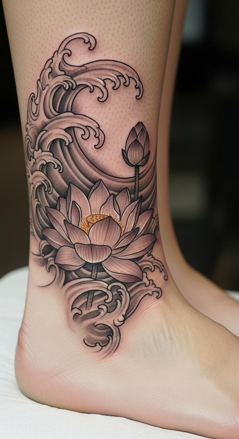 Water waves lotus tattoos depict ripples around the bloom. It shows roots in fluid motion. Practice with watercolors on paper. This costs little. Get wave templates online. Temporary designs are about $3. Artists with nature themes charge $80. Place on your side for fluidity. Add bubbles for a personal note. This design evokes calm waters.