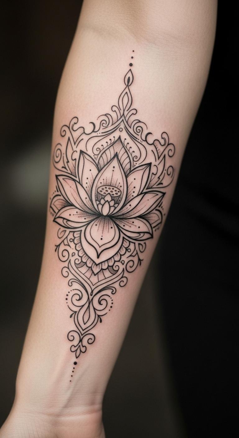 Forearm lotus tattoos balance visibility and expression. The area lets the design stretch and flow. Imagine petals wrapping around your arm. Practice with arm bands made of string at home. It’s a zero-cost way to test. Download free drawing apps on your phone for ideas. Temporary arm wraps cost about $5. Choose artists skilled in forearm art; prices start at $100. This placement shows off your story to others. Blend in geometric shapes for a modern twist. Make it yours with added symbols. The design stays prominent and meaningful over time.
