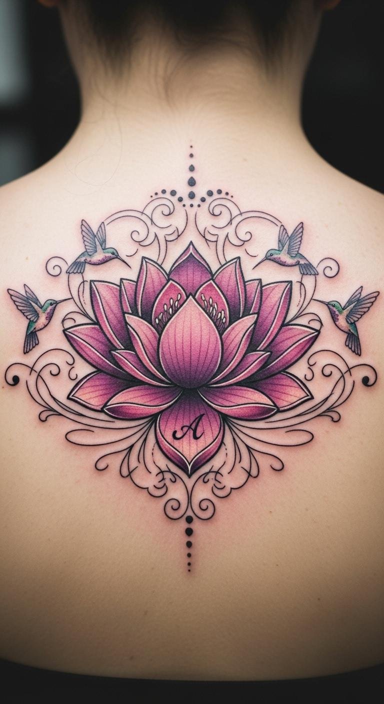 Upper back lotus tattoos provide a canvas for larger, flowing designs. The spot allows for symmetry and hidden meaning. Think of the lotus rising from your spine. Draw outlines on your mirror with washable markers. This DIY step costs nothing. Use printable templates from free sites to guide you. Temporary back decals are available for under $10. Select an artist who handles detailed placements well. Fees could be around $200 for intricate work. This area symbolizes personal growth and protection. Incorporate elements like vines for a unique touch. The design stays private yet powerful. Keep sessions short for comfort during the process.