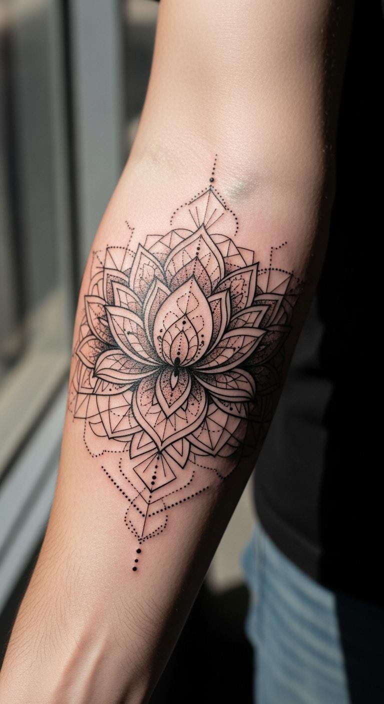 Geometric lotus tattoos mix shapes and flowers for a modern edge. Picture triangles and circles framing the petals. This style adds a structured feel to the natural bloom. Draw inspiration from mandala elements at home. Use graph paper and a ruler for your own sketch. It’s a fun, affordable way to experiment. Look for geometric stencils online, costing just a few dollars. Apply them with henna for a temporary try. Choose an artist skilled in sacred geometry to ensure clean lines. They might offer packages under $200 for smaller designs. Place it on your forearm for balance and visibility. Bold patterns like this pop with black ink. It represents harmony in a simple way. Mix in personal symbols, like stars, to make it unique. This approach keeps your tattoo meaningful and eye-catching.