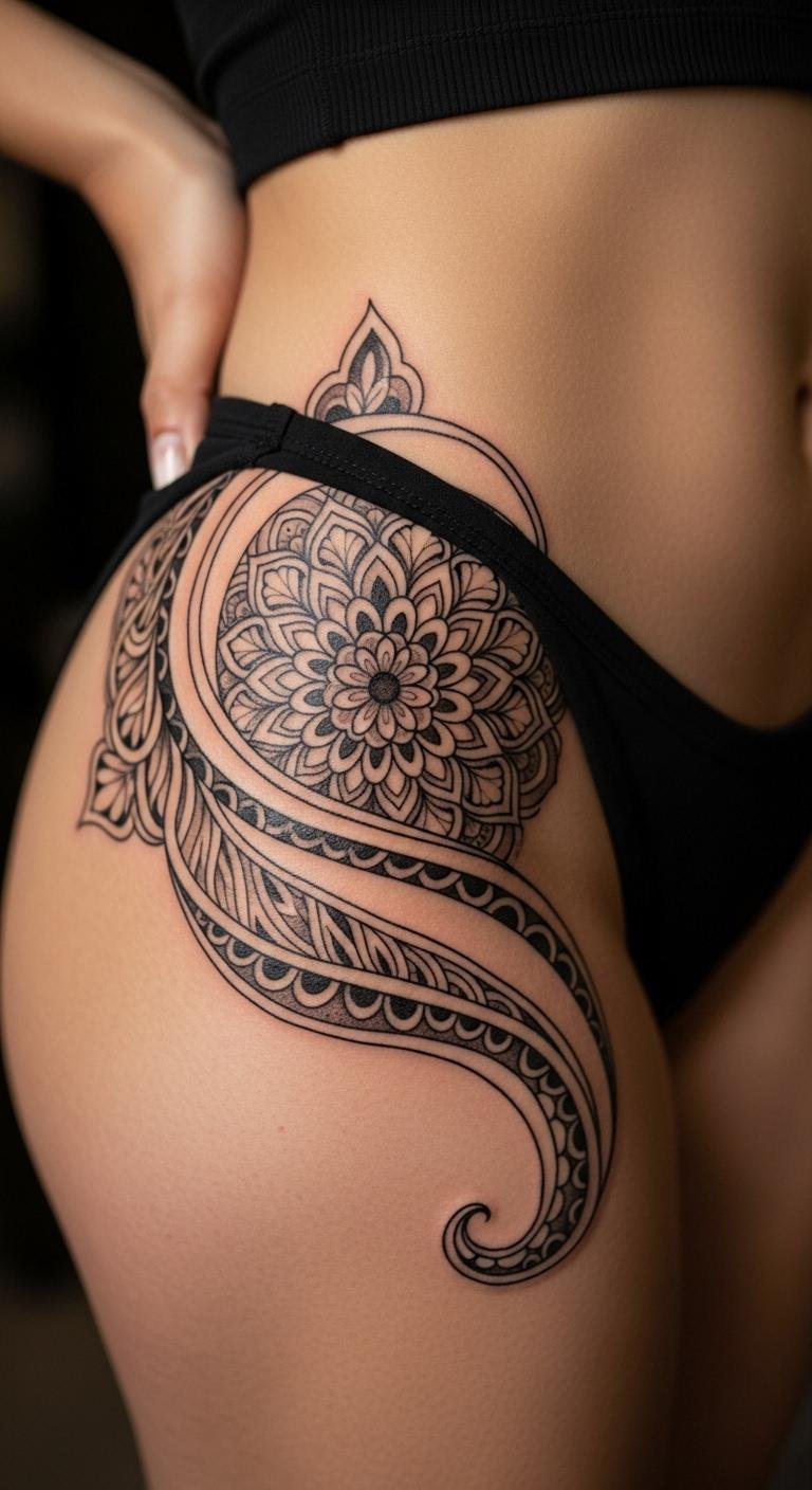 Feminine energy flows in mandala tattoos. Imagine it as grace. You embody. You nurture. Opt for curved designs. Gentle start. Draw curves on fabric. Create softly. Bold the flow: feminine curves. Tattoo elegantly. Use ribbons for shapes. From home. This celebrates your essence.