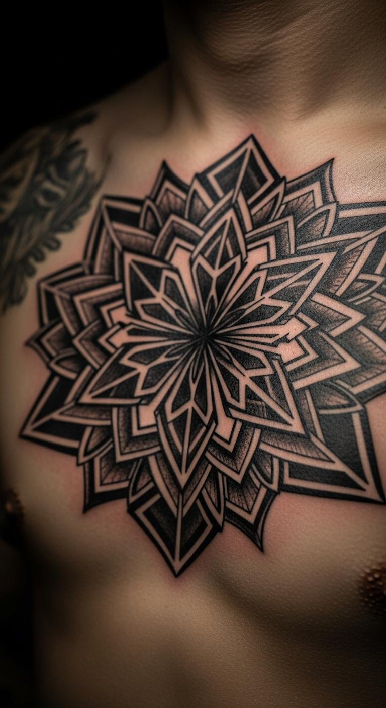 Cosmic connections mark this mandala tattoo. View it as a star map. You gaze up. You wonder. Opt for designs with celestial shapes. Go budget. Use star stickers on paper. Arrange them in circles. Easy start. Bold the stars: cosmic patterns. Put it on your chest. Craft with glow-in-the-dark tape at night. Under $3. This links you to the universe.