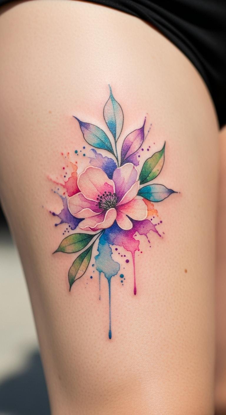 Watercolor tattoos add an artistic flair to classics like flowers. They represent beauty and emotion in a fresh way. Put it on your thigh for a personal spot. Draw soft blends using watercolors and paper at home—it’s cheap and creative. This prep work lets you refine ideas without pressure. Look for artists offering watercolor specials to save. Choose fewer colors for affordability. Make it yours by mixing in a favorite flower. It’s straightforward and expressive. Use washable markers to mock it up first.