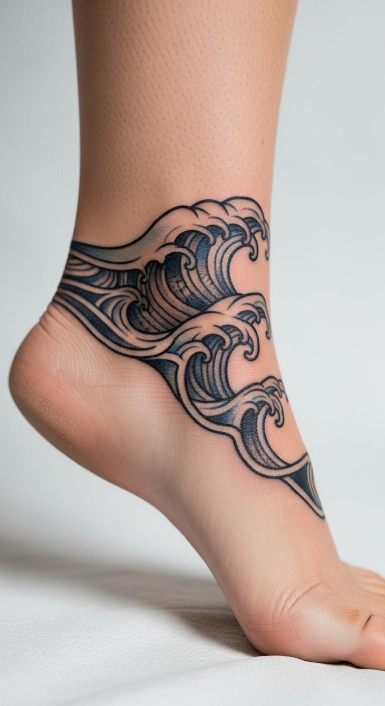 Ankle wave lines suggest flow and movement. They represent life’s rhythms with curving strokes. Position them around your ankle bone. Expect $50; compare options first. Draw waves on your leg; this DIY step clarifies ideas. Seek artists good with lines to cut costs. Waves add a dynamic feel. Carry this design as a reminder of adaptability, boosting your confidence.