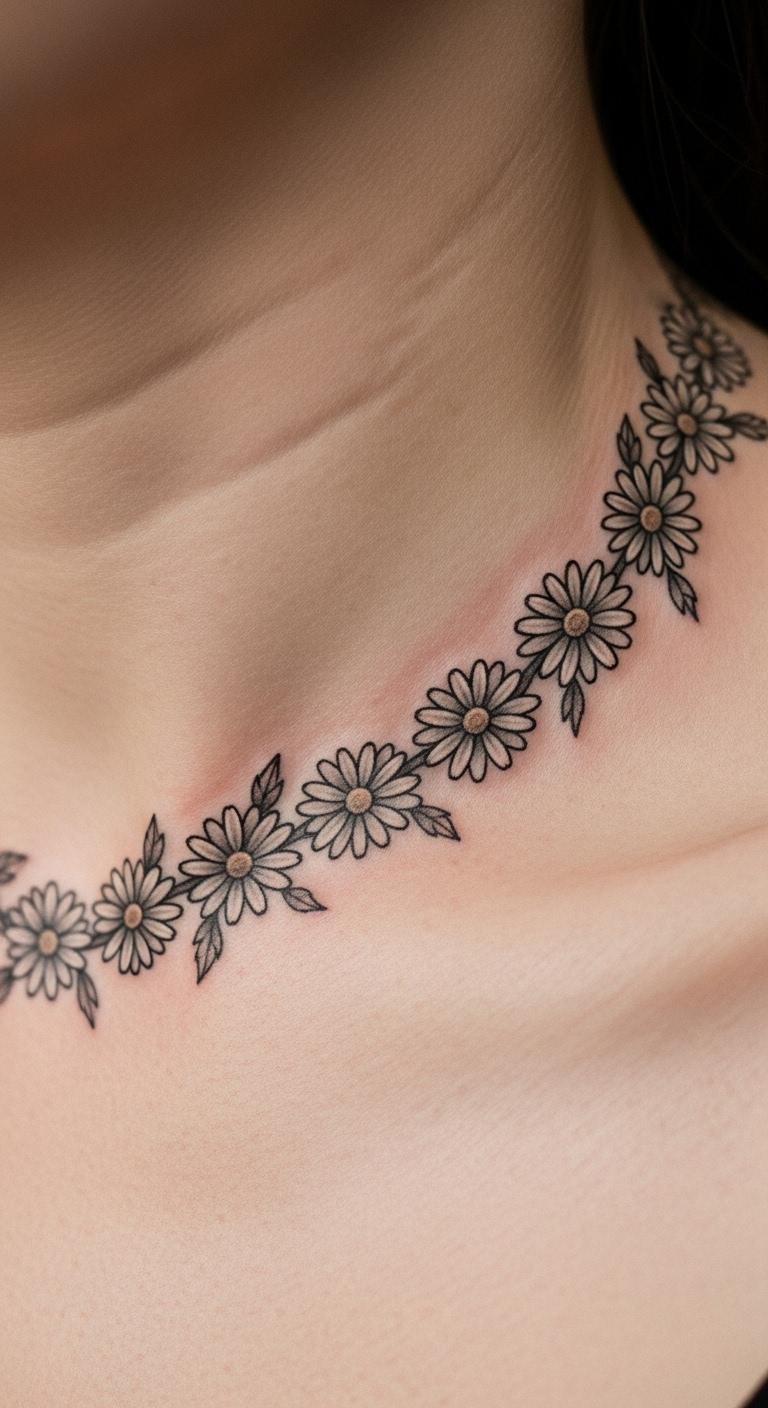 Floral daisy chains offer fresh, light vibes. They symbolize joy and nature with linked flowers. Put them on your collarbone for elegance. This runs about $50; look for package deals. Sketch daisies on chain paper; it’s a quick home activity. Find artists who do florals affordably. Use fine lines for a delicate effect. Wear it as a sign of happiness, helping build your daily assurance.