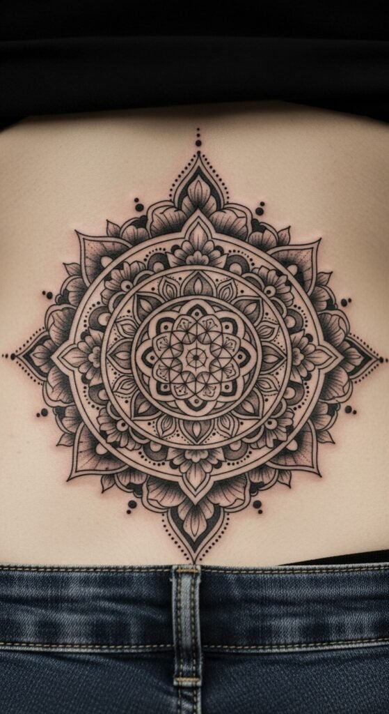 A lower-back mandala offers a bold yet simple design. Use repeating lines for the circle. It’s great for a personal statement. Look for local tattoo deals to keep costs low. Many places offer this style cheaply. Trace a mandala on paper before going. This makes choices easier. Stick to basic black for savings. Complete it in a couple of visits. Wear high-waisted pants to hide it. This spot empowers your story. Apps let you visualize it quickly. Upload and rotate views. Care with daily lotion from your routine. Your mandala holds strong. Use it as a quiet confidence builder.