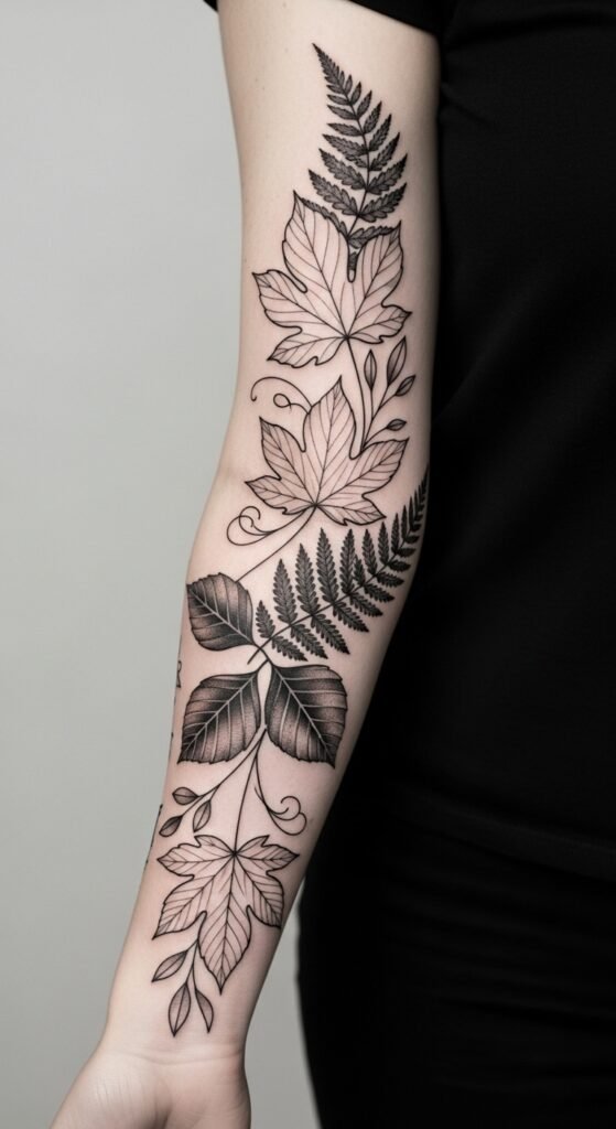 Nature leaves bring outdoor vibes. Place on your arm for visibility. Shape it simply. Look for nature-themed deals. Local spots offer them. Draw leaves in your sketchbook. Get creative. Use one color. Finish affordably. Sleeve it up. This tattoo feels real. Apps help visualize. Try it on. Keep it clean. Your leaf thrives. Connect with nature daily.
