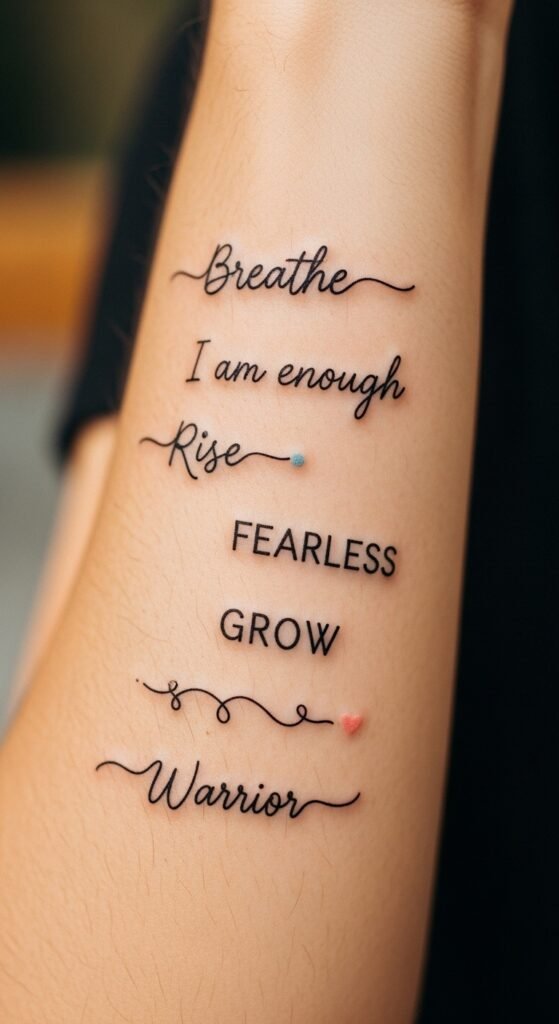 Empowerment phrases in lines motivate. Wrist is ideal. Keep phrases straightforward. Look for text deals. Groups recommend. Jot phrases in a book. Select favorites. Use clean font. Get it budget-wise. Bracelets conceal. This tattoo inspires. Tools mock up. See it clear. Maintain simply. Your phrases empower. Live by them.