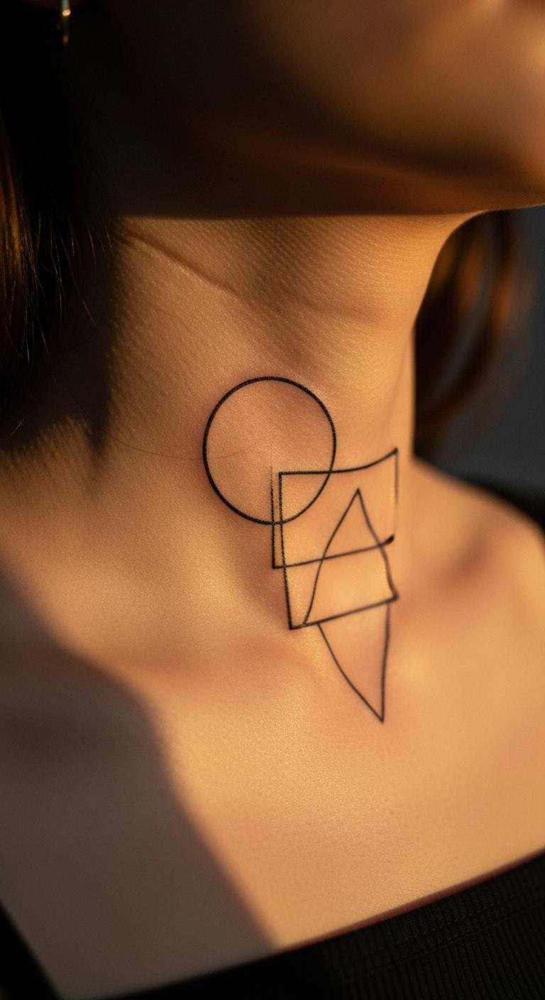 Abstract shapes overlap for a unique look. Place them on your neck for impact. Keep forms basic. Find low-cost abstract pros. Community groups share tips. Draw shapes on a notebook. Experiment freely. Opt for outlines only. Complete in minutes. Scarf it if needed. This tattoo sparks creativity. Apps preview accurately. Snap and adjust. Care with daily habits. Your shapes remain. Use them as mood lifters.