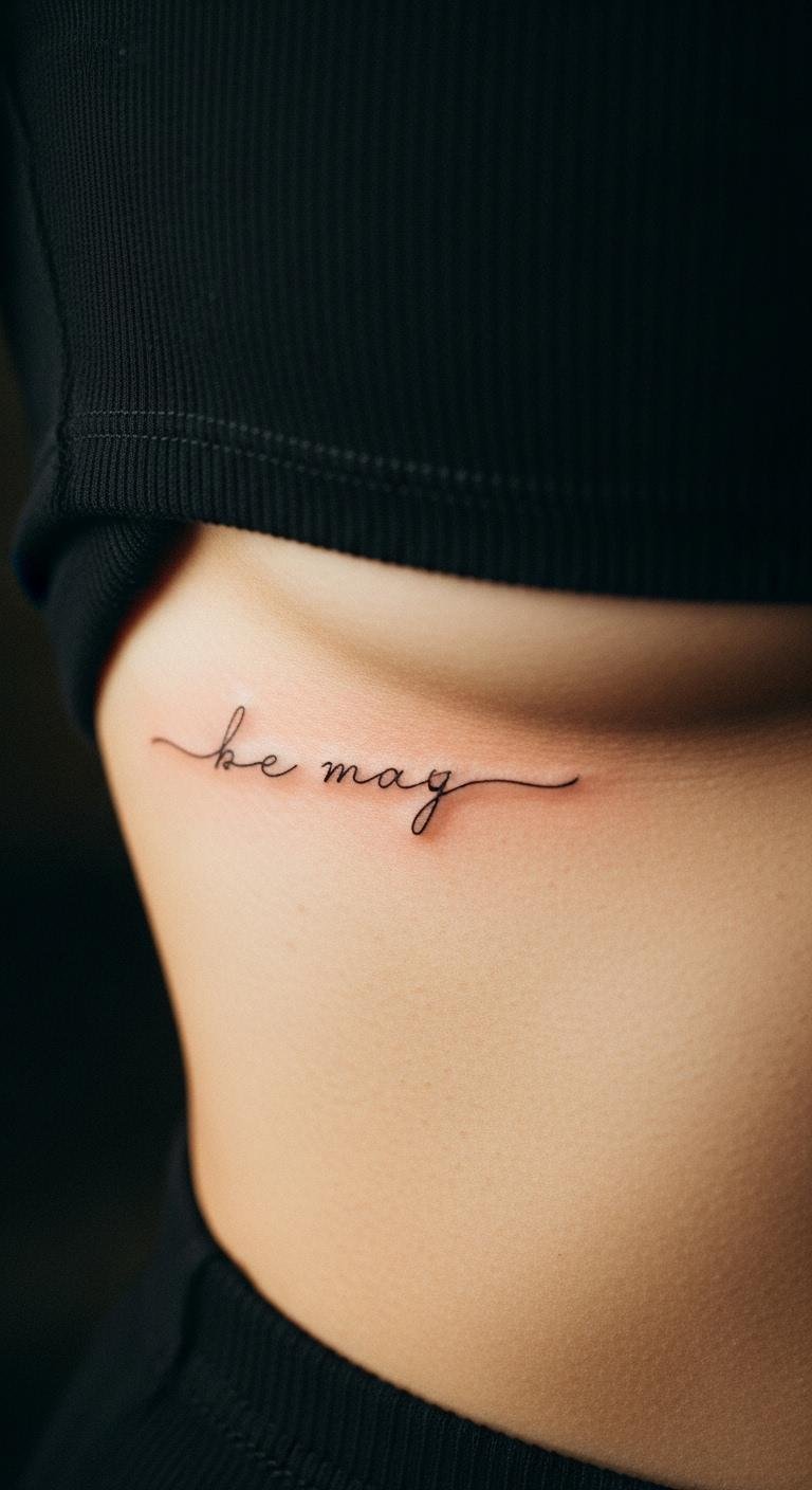 Script words in thin lines add meaning. Try your rib for intimacy. Keep text short. Find word specialists at good rates. Reviews guide you. Write words in a journal first. Choose wisely. Go with thin script. Wrap up fast. Clothing hides it. This tattoo speaks volumes. Apps test placement. Adjust easily. Care simply. Your words endure. Make them your mantra.
